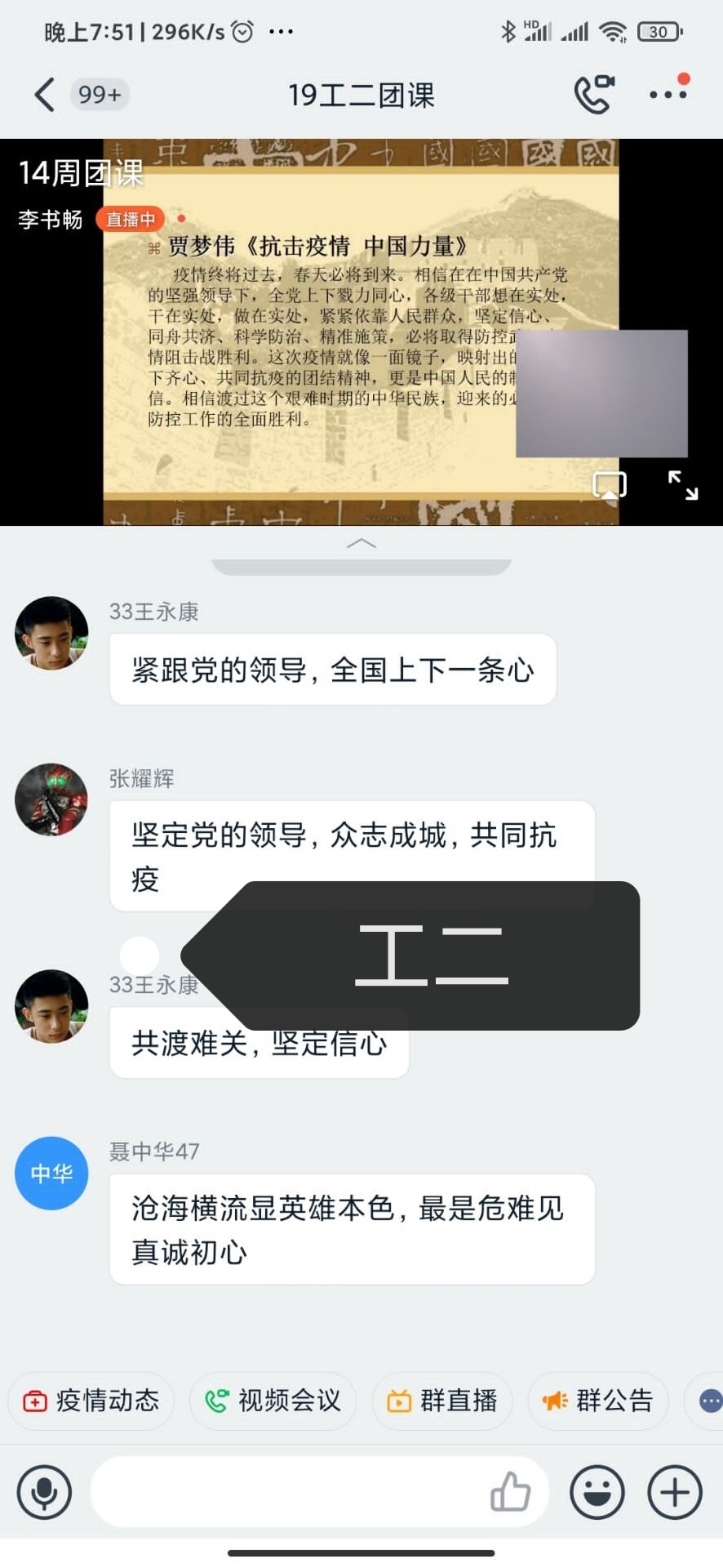 为激励青年团员切实把共同抗击疫情斗争作为推进学校思想政治教育的重要实践和生动教材。5月14日,我院组织开展“中原抗疫勇担当,众志成城铸雄关”线上主题团课。参加本次团课的有19级四百余名学生。
