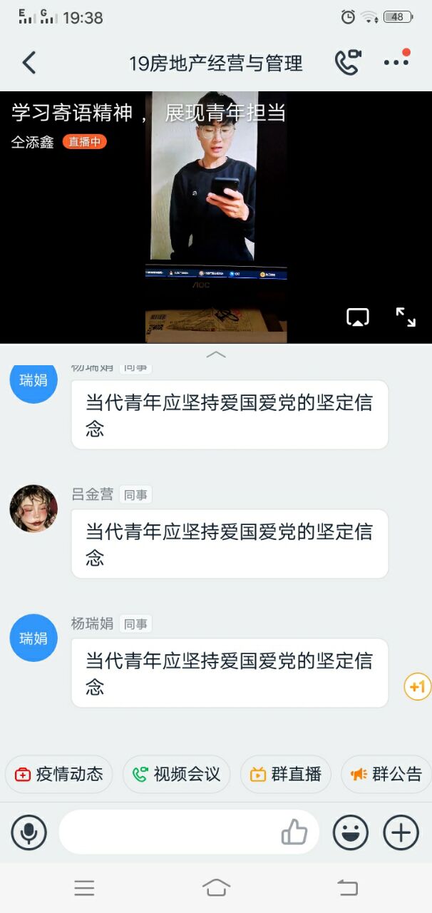 团课中,主持人带领同学们一起观看了习近平总书记在73届世界卫生大会上的致辞,使同学们认识到构建人类卫生健康共同体的重要意义,习近平总书记的致辞,引发大家热议,同学们频繁进行线上连麦,积极发表感想,纷纷表示将自觉做好自我防护,并牢记时代赋予的职责使命,练就过硬本领,为伟大祖国致力于构建人类命运共同体和推动全球抗疫合作的大国担当点赞,立志要认真学习,坚定不移勇担强国使命。
