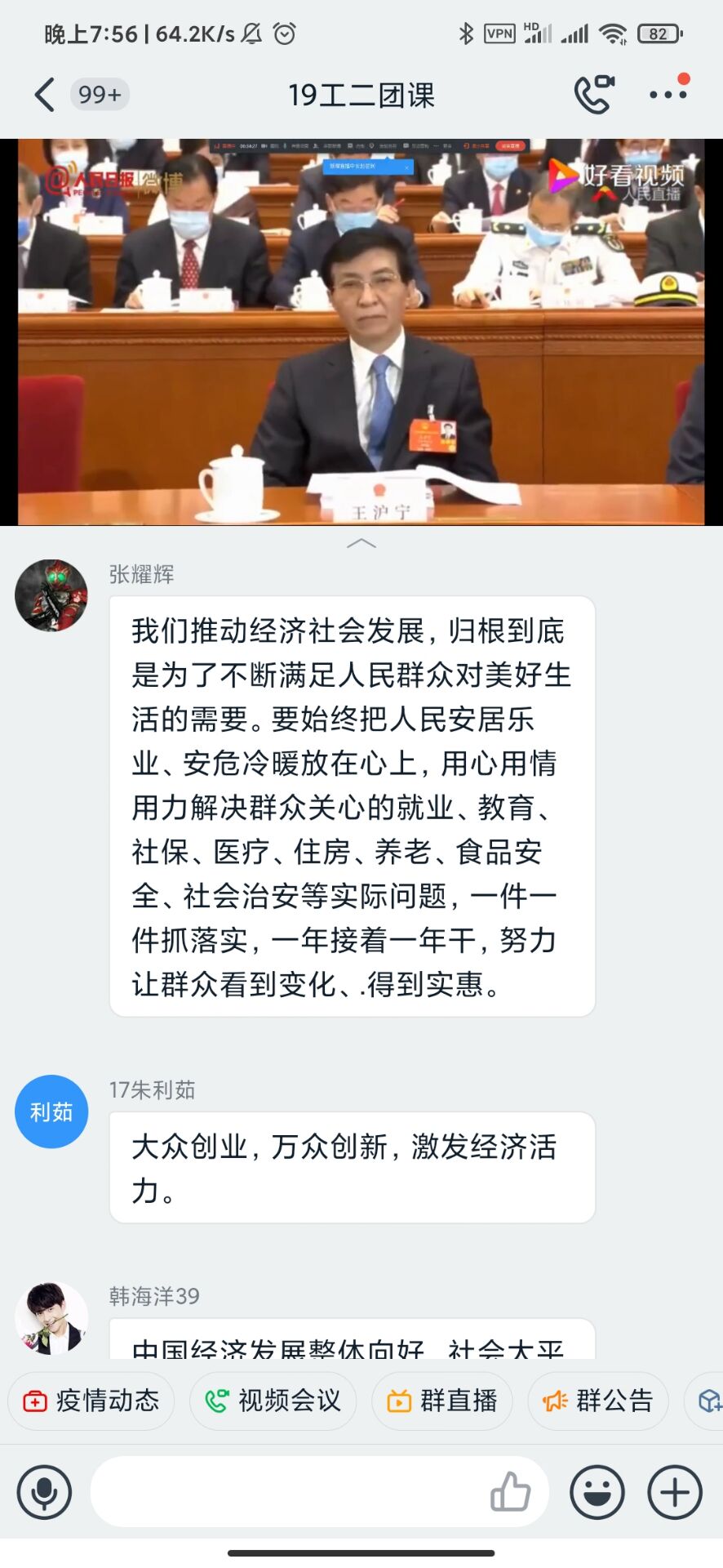 团课上,同学们围绕“两会”关键词,热议了我国经济社会发展新常态,畅谈了青年学子的青春梦。新时代新气象,新征程新担当。同学们结合自身专业和观看"两会"视频的直观感受,进行了深入的交流探讨,纷纷阐述了自己所理解的两会精接班人而不断努力。同学们表示:“两会”召开是我们国家政治生活中的大事。李克强总理做的政府工作报告为国家经济和社会发展做出了总结,指明了方向,激励人心。随着国家防疫和供给侧结构性改革的不断深入,创新驱动发展战略的深入实施,实体经济活力不断释放,创新能力和效率进一步提升。作为新时代的青年,我们将奋力拼搏,创业创新,用青春助力河南经济跨越腾飞。