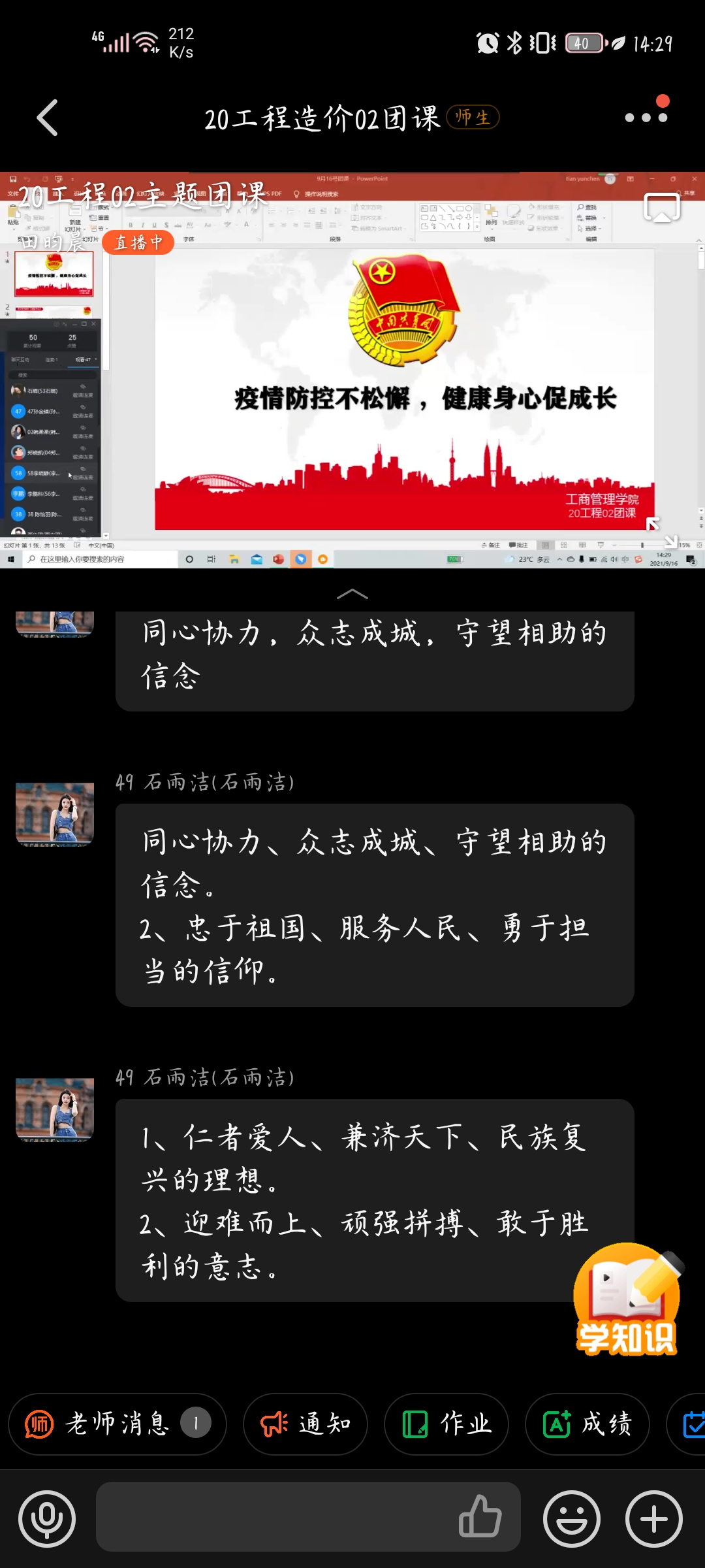 团课伊始,各班团支书带领大家再次回顾防汛抗疫相关事件,并组织班级内参加志愿活动的同学连麦发言,讲述自己的志愿经历,所有志愿同学通过踊跃分享,都获得了大家的称赞。团支书号召团员们向身边的榜样学习,把灾难当教材,上好防汛抗疫这堂人生大课。之后,团支书结合前期学校开展的“在校生思想状况调查”结果和本班同学的实际情况,引导同学们重视生命教育,自觉培养良好的居家学习生活习惯,调整身心健康状态。接着,各班以“居家学习生活”为话题展开讨论,针对同学们反映的困难和困惑,20物业01班组织委员表示我们应该互帮互助,结对帮扶,热爱生活,增强克服困难和战胜疫情的信心与决心。还有不少热心同学在疫情防控知识、学习习惯养成、居家锻炼技巧和心理健康调适等方面提出了自己的建议和方法。团课井然有序、氛围融洽。
