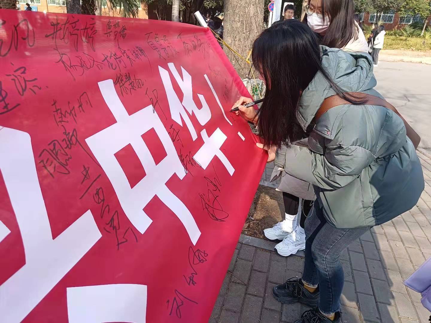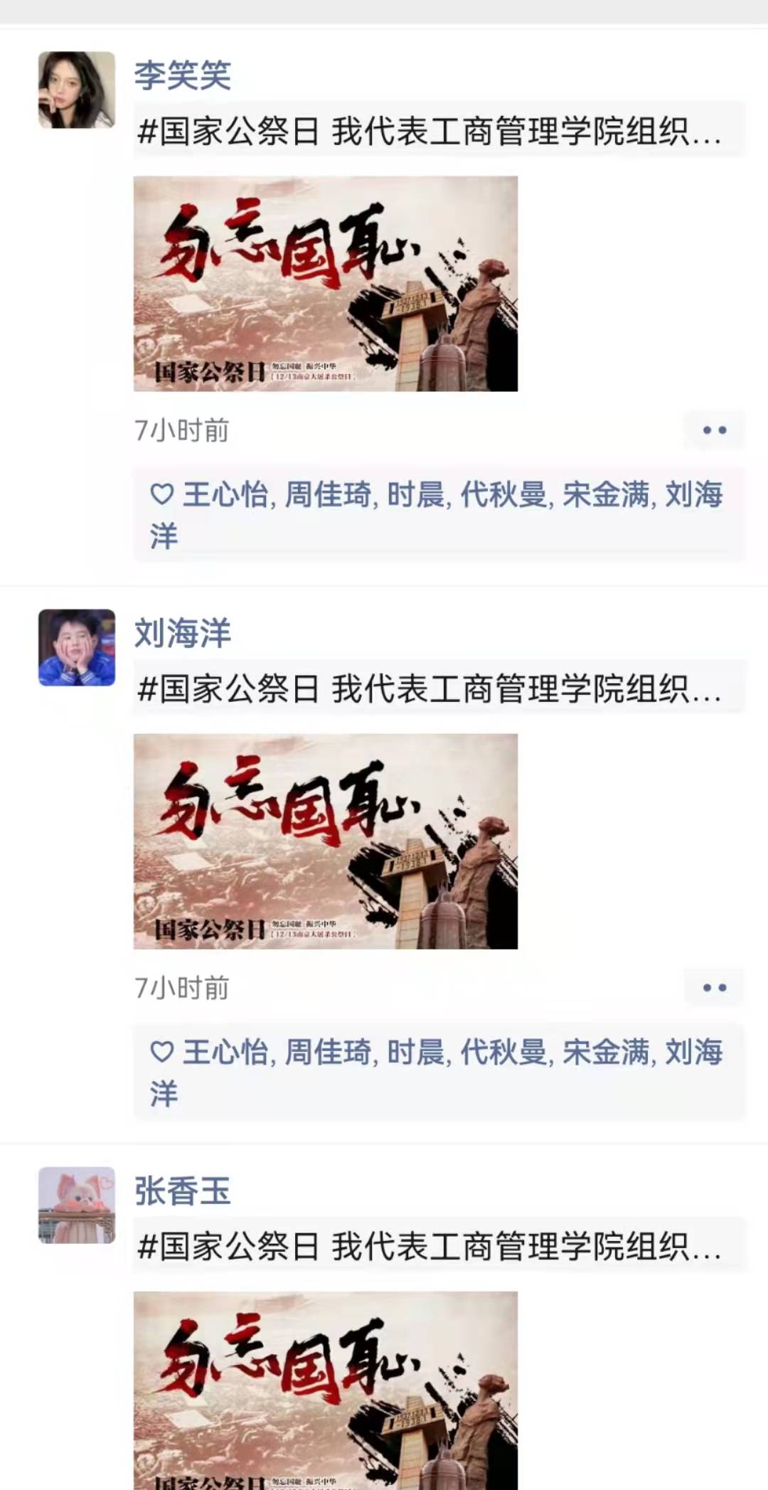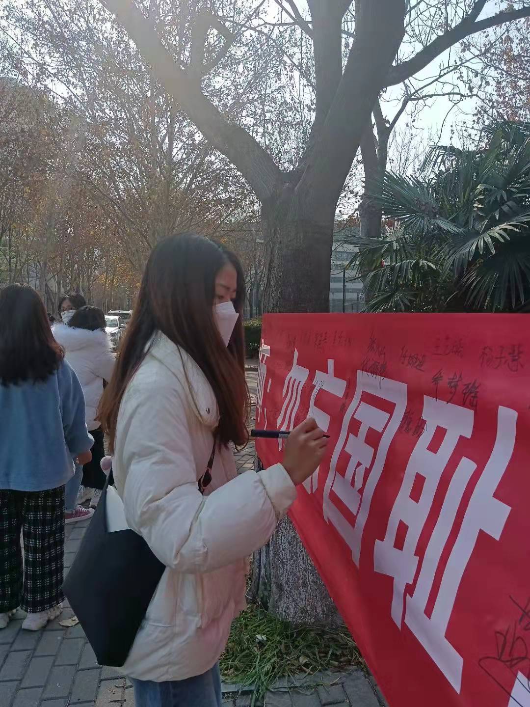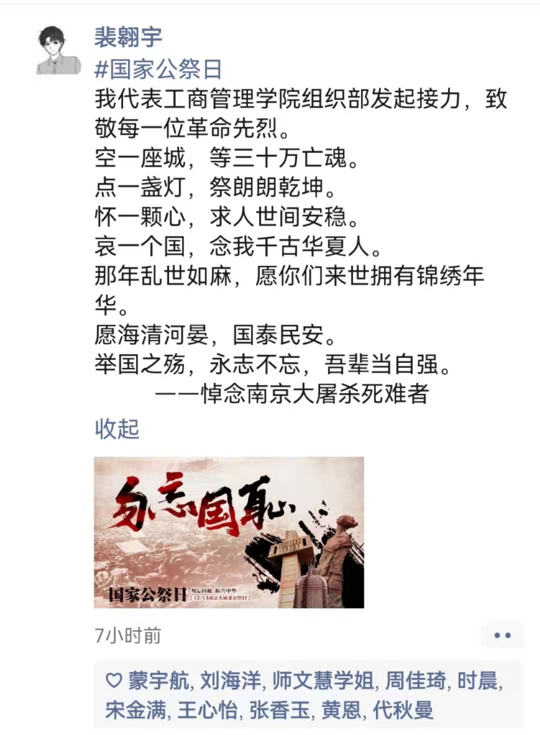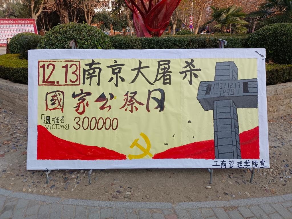 12月13日凌晨,ok138cn太阳集团古天乐团学会组织部在微信朋友圈纷纷发起“不忘公祭日,爱国有我在”红色传承接力活动,用这种方式深切表达对南京大屠杀遇难同胞的哀悼,激励广大青年铭记历史、担当使命;中午,生活权益部在红色花蕊和六号宿舍楼下挂起横幅,开展以“铭记历史,勿忘国耻”为主题的宣誓签名活动。每位同学认真的在横幅上签上自己的名字,一笔一划,遒劲有力;一言一行,尽显真挚情感。那一刻,横幅上写的不仅仅是名字,更是对逝者的哀思;那一刻,眼睛里闪烁的不仅仅是泪水,更是挺起祖国脊梁的决心;宣传部,更是手绘公祭日宣传海报,来纪念每一位逝者,反思那一段沉痛的历史,同时在心里默默许下誓言:为中华民族伟大复兴而读书!