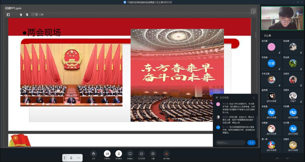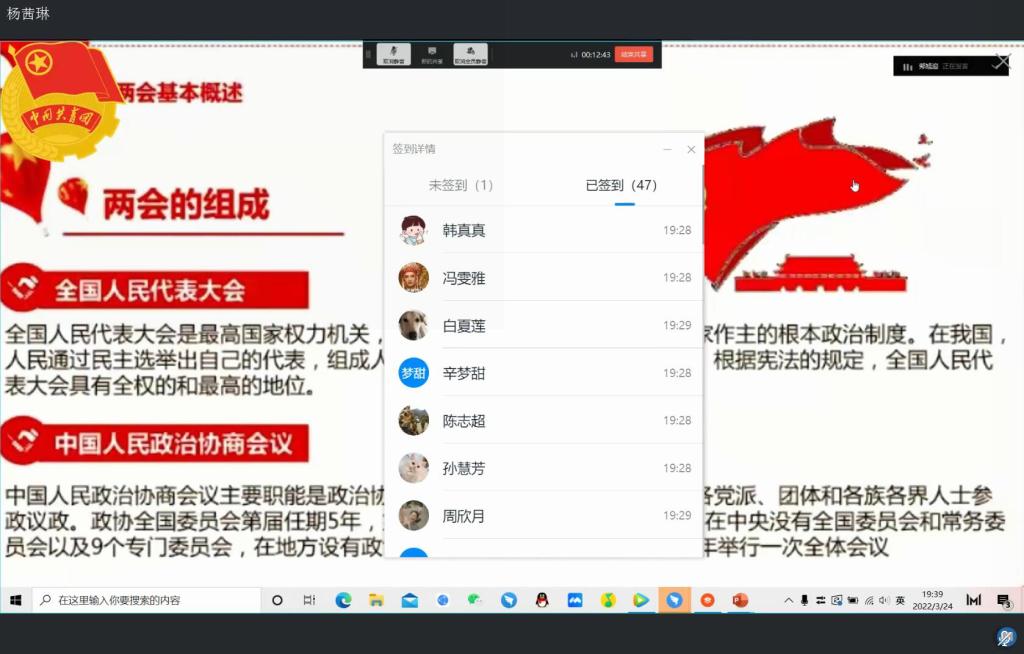 2022年3月24日晚,ok138cn太阳集团古天乐于线上开展“学习两会精神,凝聚奋进力量”主题团课,引导广大青年学生关注“两会”议程、学习“两会”精神,坚定理想信念,扛起使命担当。21级各专业共7个班级参与此次团课学习。