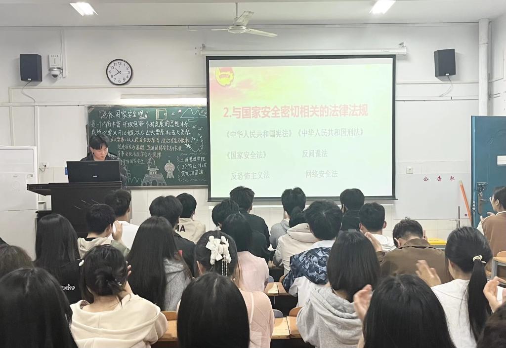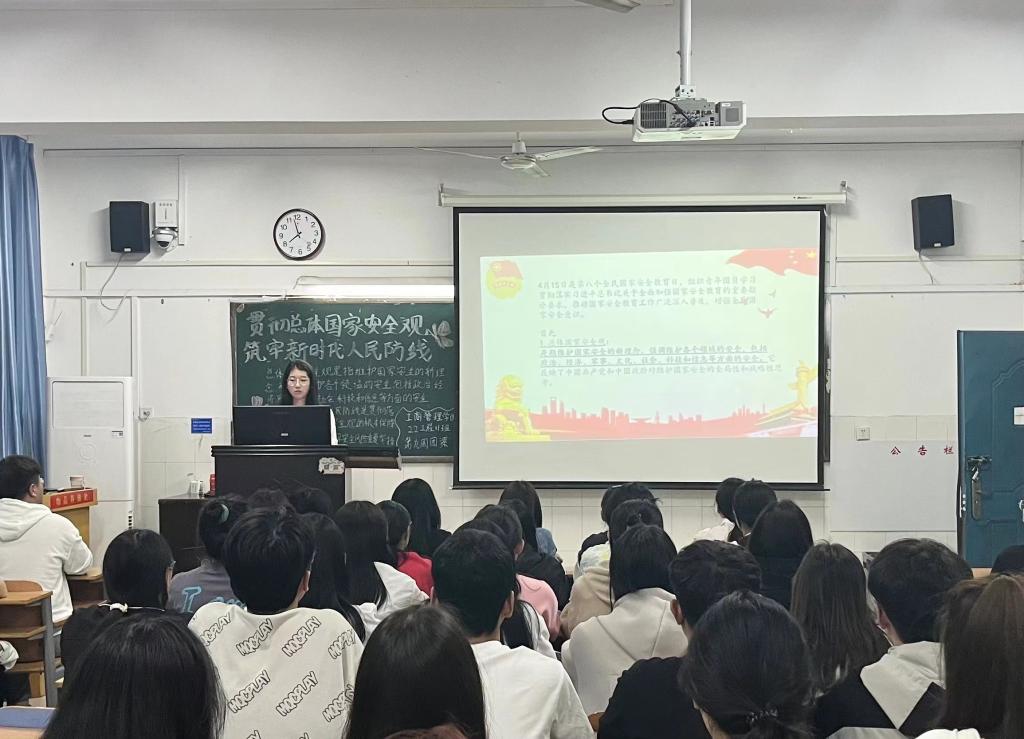 团课伊始,各班团支书通过视频播放,从总体国家安全观的概念、内涵、以及与人民生活的联系等方面带领同学们由浅入深地认识了总体国家安全观,国家安全是国家生存与发展的重要保障,只有国家安全稳定,广大青年学生才能拥有良好的学习环境和生产、生活环境,生命安全、财产安全才能得到保障,进而创造更加美好的生活和未来;接着,各班团支书向同学们讲述了当前和平与动荡并存的国际局势,指出全面加强国家安全教育的重要性,号召同学们增强国家安全意识、为维护国家安全积极建言献策、检举并制止危害国家安全的行为、监督和维护国家安全工作的开展。最后,各班团支书带领同学们齐声合唱团歌,深刻展现出同学们坚定维护总体国家安全、捍卫国家利益的决心。大家纷纷表示,在今后的学习与生活中,将努力做到自觉关心、维护国家安全,为建设安全稳定的国家贡献力量。