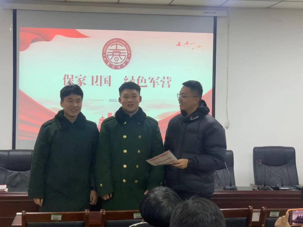 付裕从入伍流程、部队发展、经济待遇、学历提升、军属待遇等方面,解读大学生参军入伍的相关政策,让有参军意愿的同学更加深入地了解了军队的生活和工作环境。随后,他立足于强军梦离不开优质的大学生兵源的实际情况,带领同学们充分认识征兵工作的重大意义,使他们意识到征集大学生入伍不仅是个人成长的征程,更是为国家和社会做出贡献的方式。最后,由23级工商管理专升本班闫礼铭、王慧超作为退役士兵代表进行发言,他们用自己的亲身经历告诉同学们,参军入伍不仅可以锻炼意志品质、培养团队合作精神,还能为个人的职业发展打下坚实的基础。同学们纷纷表示,他们将会积极响应国家号召参军入伍,为国家的国防事业贡献自己的力量。