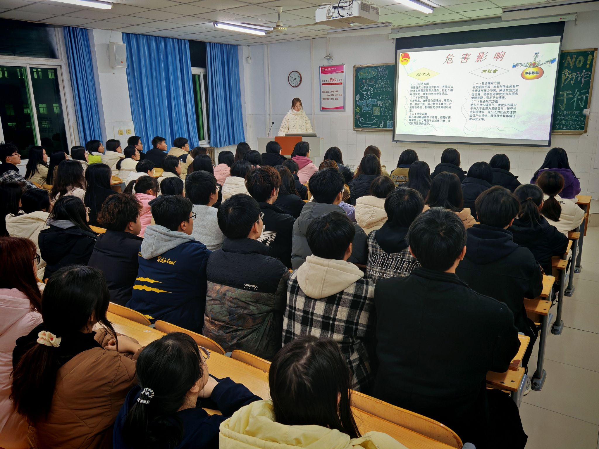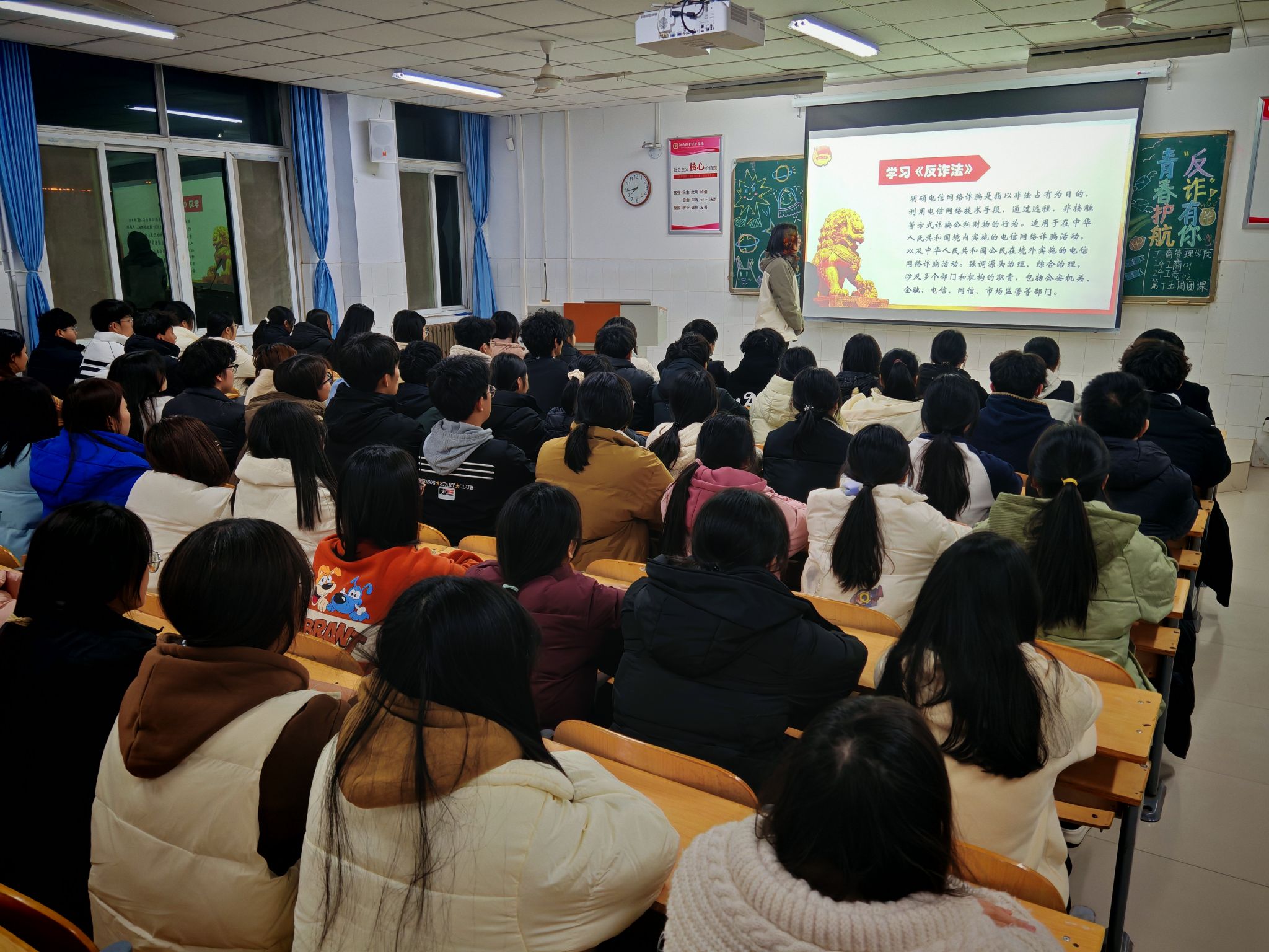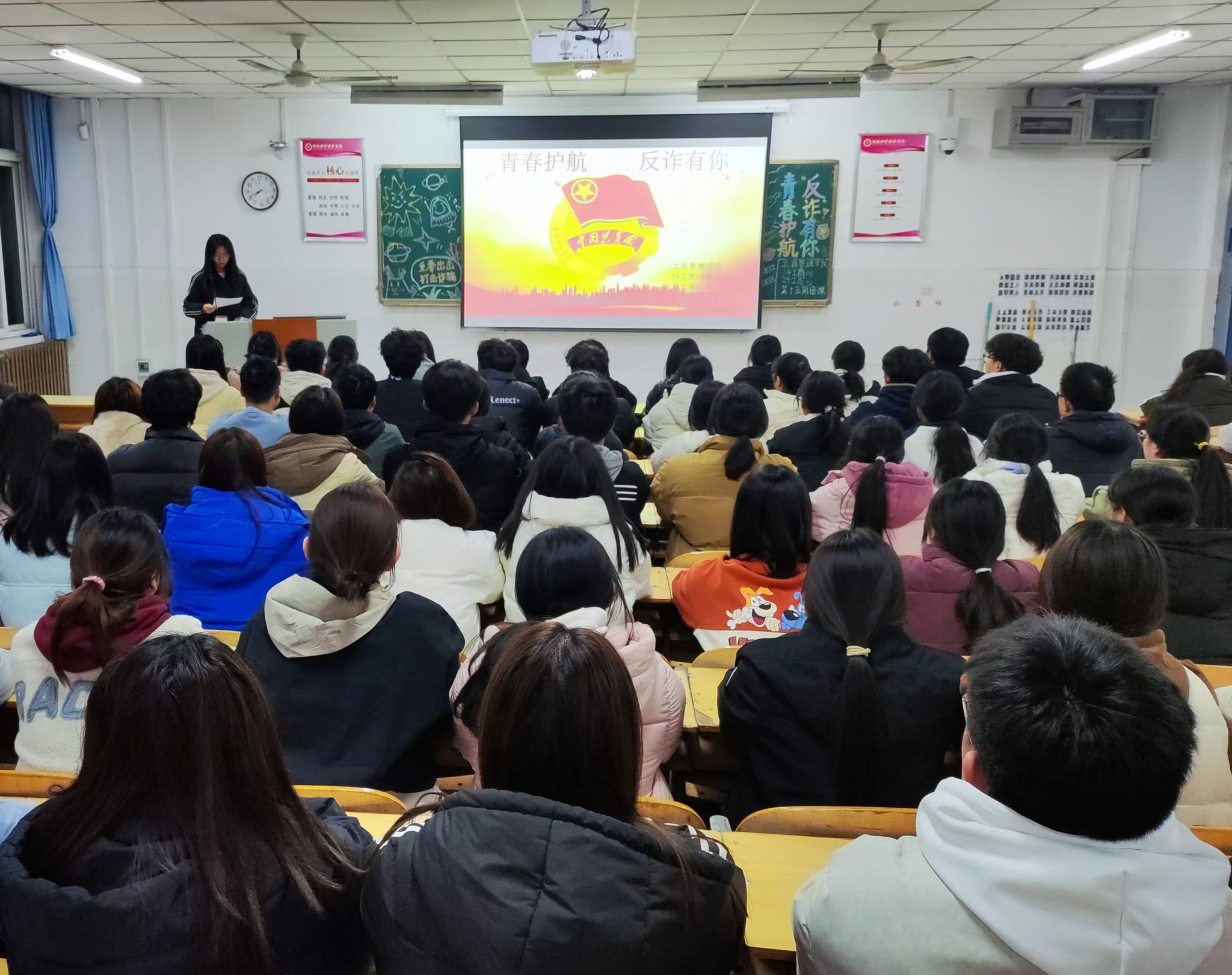 团课伊始,团支书通过PPT展示,向同学们详细介绍了《中华人民共和国反电信网络诈骗法》的相关内容,以及刷单返利、“校园贷”等电信网络诈骗的常见手法和防范措施,使同学们对电信网络诈骗有了更加直观和深入的了解。随后,团支书组织同学们分组进行讨论。在讨论中,大家积极分享了自己在日常生活中遇到的类似情况和应对策略,并相互借鉴和学习。同学们纷纷表示,将提高自我保护能力,积极参加各类反诈实践活动,将反诈知识牢记于心,外化于行,为构建平安校园、和谐社会贡献自己的力量。最后,团支书对本次团课作出总结,号召同学们积极投身到反电信网络诈骗的宣传和实践中去,时刻保持警惕,并鼓励同学们在日常生活中多关注社会热点和时事新闻,了解最新的诈骗手段和防范措施,不断提升自己的防范能力。