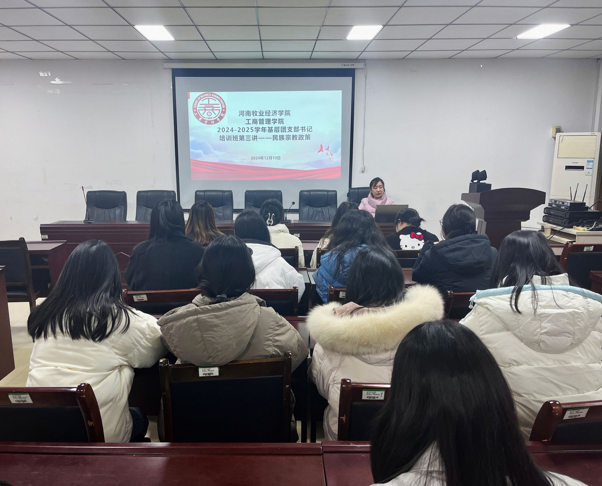 为深入学习贯彻习近平总书记关于民族宗教工作的重要论述和重要精神,进一步提升基层团支部书记对民族宗教事务的认知水平与工作能力,ok138cn太阳集团古天乐于12月10日晚在227会议室开展2024-2025学年基层团支部书记培训班(三)——民族宗教政策。本次培训由ok138cn太阳集团古天乐团委副书记席亚芳主讲,学院全体2024级团支部书记参与本次培训。