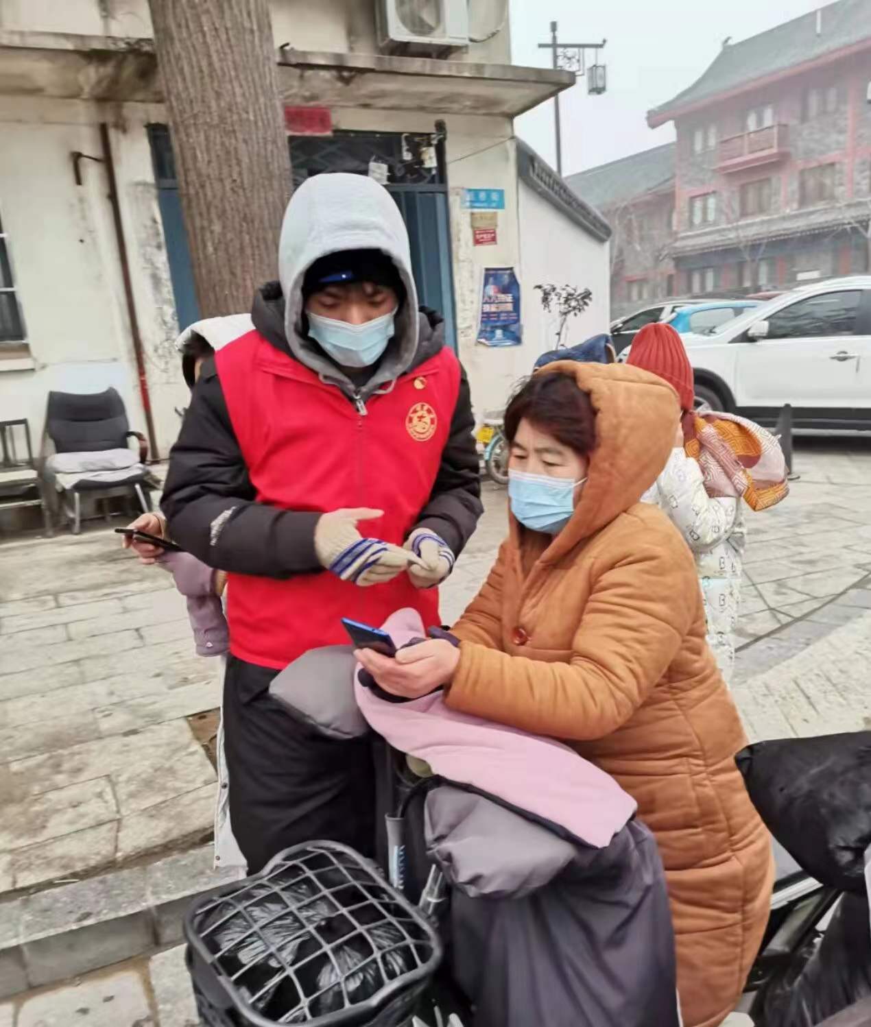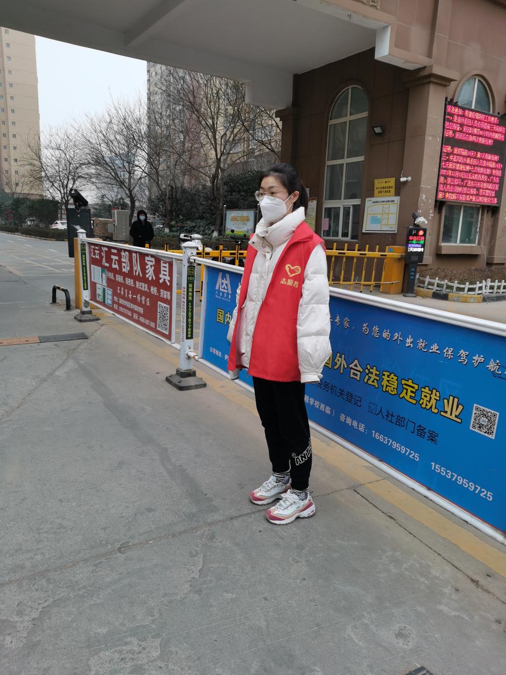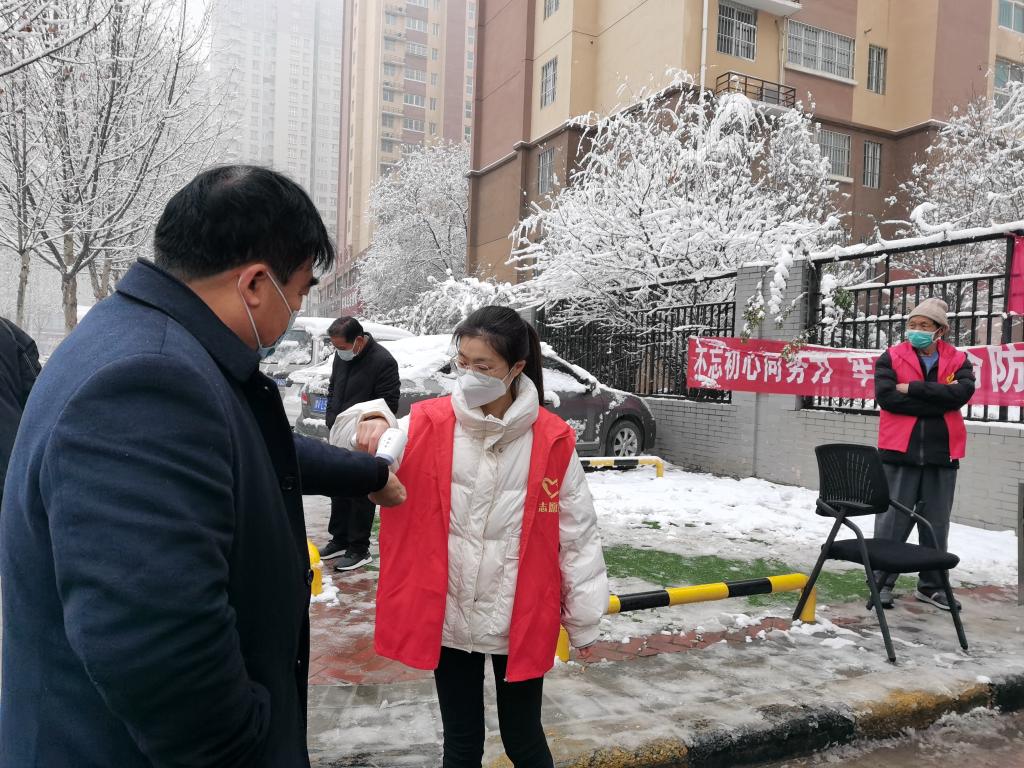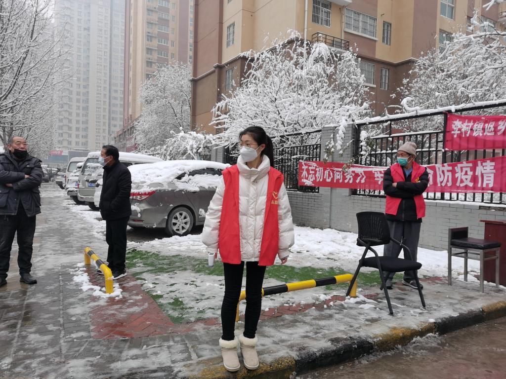 她的任务是在门口测量进入小区人员的体温,检查过往人员的其健康码和行程码是否符合要求。每天都有大量的人员进进出出,人员流动性大,防疫任务艰巨。正值赶上下雪天,室外气温低,他每天在门口站七个小时,手长时间暴露在外面,早已失去了知觉。虽然她正是青春健壮之时,但是也感到微微的疲倦。但他想到那些需要日日夜夜站岗,不能休息的医护人员,军人,就立刻揉揉眼睛,继续投入疫情防控工作中。