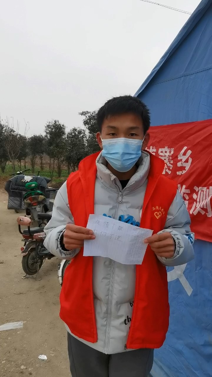 2022年1月份,河南省许昌市爆发了疫情,已经返乡的21工商02苏雨朋同学,第一时间向村里报名提出申请做一名志愿者,帮助村里边尽快地完成核酸检测工作,保证不漏一户一人,从而更好地保证大家的安全 。在核酸检测志愿者工作中,他负责信息录入。通过几天的志愿活动,他感觉收获很大,认识到了疫情防控以及核酸检测的重要性,同时因能为自己的家乡贡献一份力量而感到非常的自豪。虽然很冷很苦,但是他用自己的实际行动去践行了时代的责任与担当。最后,他希望疫情早点结束,希望大家的生活都能恢复正常。许昌加油!中国加油!