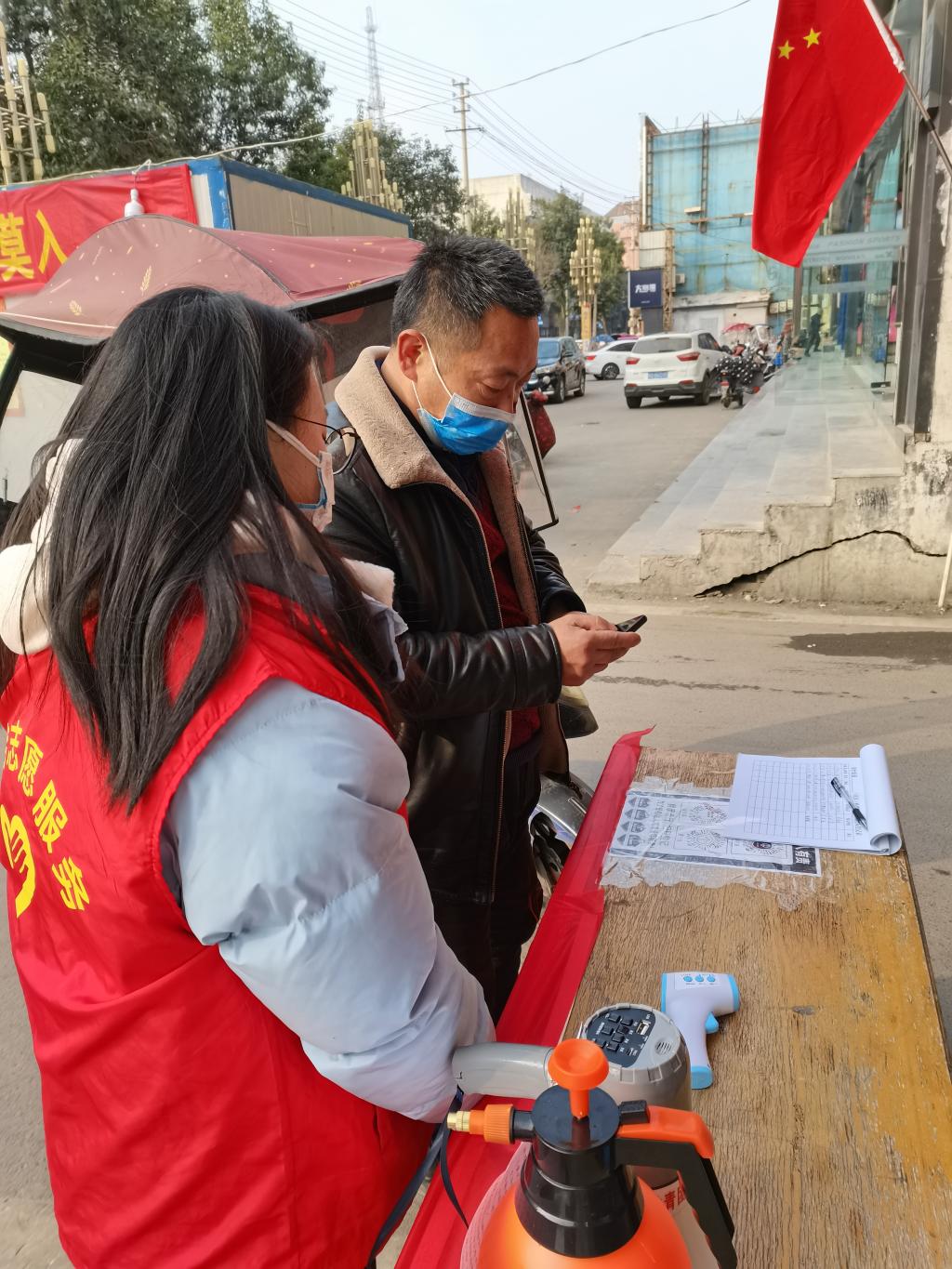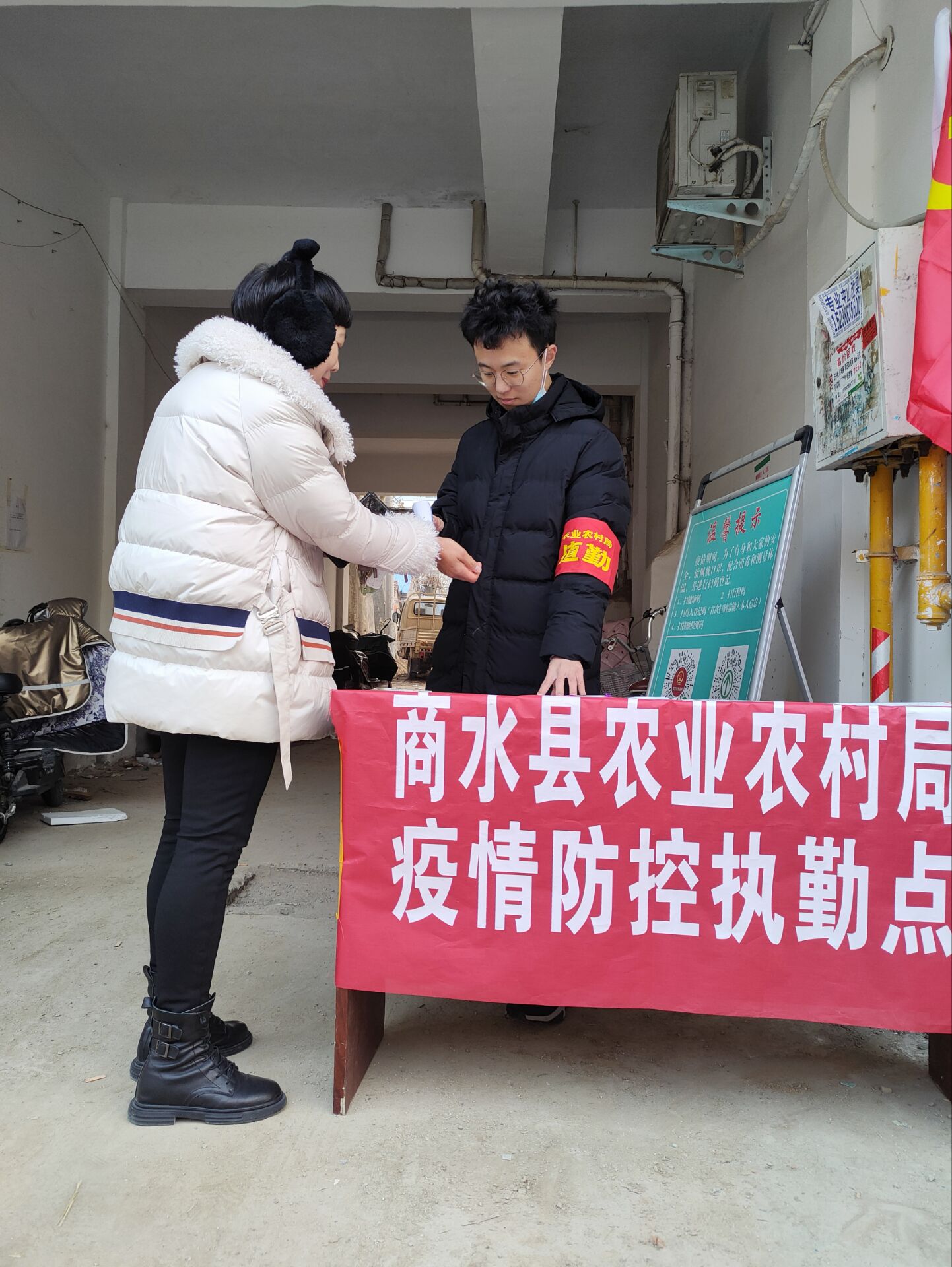 来自ok138cn太阳集团古天乐19工商02班的赵艳艳同学,正在村路口为进出的村民测量体温,并耐心指引村民完成扫码、排查登记等疫情防控相关流程。