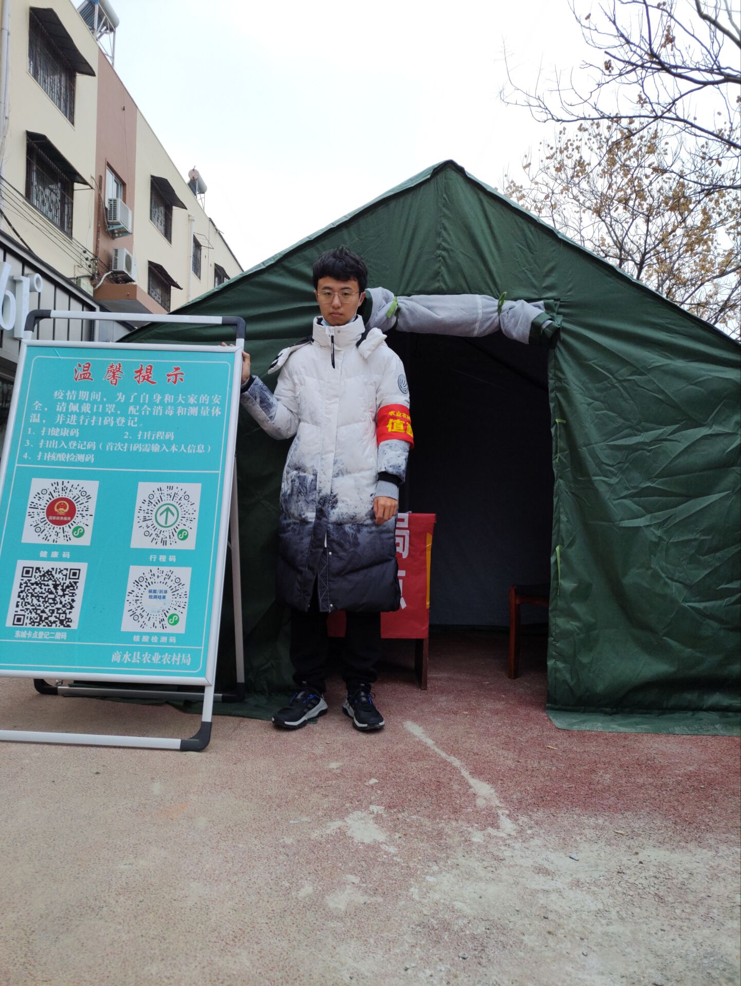 2022年初,疫情又一次在和我省各地暴发,打乱了春节前秩序,让原本热闹喧嚣的城市变得格外冷清、异常寂寞。各地疫情防控阻击战又一次开始紧张起来,在家学习的21市营01赵铭鑫同学,听到县城招募大学生志愿者后,积极响应号召参加志愿服务队,和社区工作人员一起抗击疫情,在疫情防控这场没有硝烟的战争中贡献青春力量。