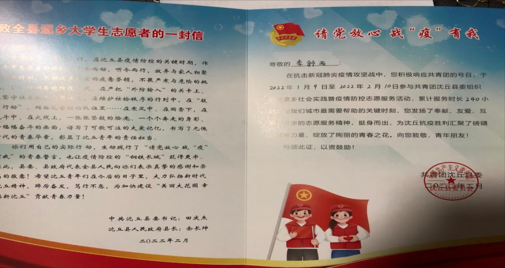 自2021年12月31日至2月13日,李舒雨同学参加大学生“返家乡”社会实践,到家乡周口市沈丘县大褚庄行政村协助疫情防控工作学习,主要做好疫情防控和房屋自然灾害排查以及填各种表格、处理一些较琐碎的事情。从最初的一无所知到现在的日渐熟练,更是让我收获了很多。通过这次的磨练,我收获满满,增强了自己的实践能力,加强了工作中的全局意识,强化学习思考,创新工作方法。