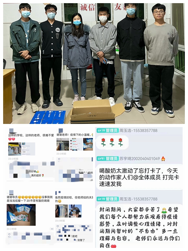 当前,疫情防控已进入攻坚时期,作为辅导员更要充分发挥知心人、热心人和引路人的作用,周玉洁老师深知把自己每一位同学守护好、引导好、安抚好就是为此次“战疫”做贡献。她不仅与学生互动交流,为大家提供必要的情感、心理支持,教给学生情绪疏导的方法窍门,帮助学生进行心理减压,更是自费为学生购买酸奶,用爱和科学的力量架起了一座“连心桥”。她告诫每位同学都要主动防护,有效应对。面对疫情要理性对待,不轻视、不恐慌。帮助学生以自信乐观的心态面对困难,做一名生命健康的守护者、认真笃学的修行者,游必有方的识图者。