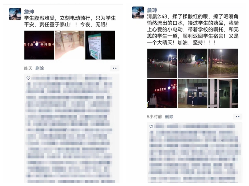 5月12日深夜,我院2019级学生梁晶晶突发腹泄绞痛,詹珅得知消息后,立刻上报学校,为避免学生乘坐公共交通增加安全隐患,他亲自将学生护送至惠济区人民医院进行急救处理,并且全程陪同做CT诊断、取药、接热水。学生深受感动,在和家长报平安的电话中说到:“从深夜到清晨,老师一直陪着我直到我结束治疗。每一天詹老师都在我们学校核酸检测现场坚持工作到最后一名学生做完核酸,有时午饭都来不及吃就要接着给我们安排发放中药饮剂、口罩和消毒液等物资,到了晚上还要处理我们学生的各种突发事件,真是没有一刻休息放松的时候。封校这么久以来,詹老师是在我们身边最切切实实的温暖......”