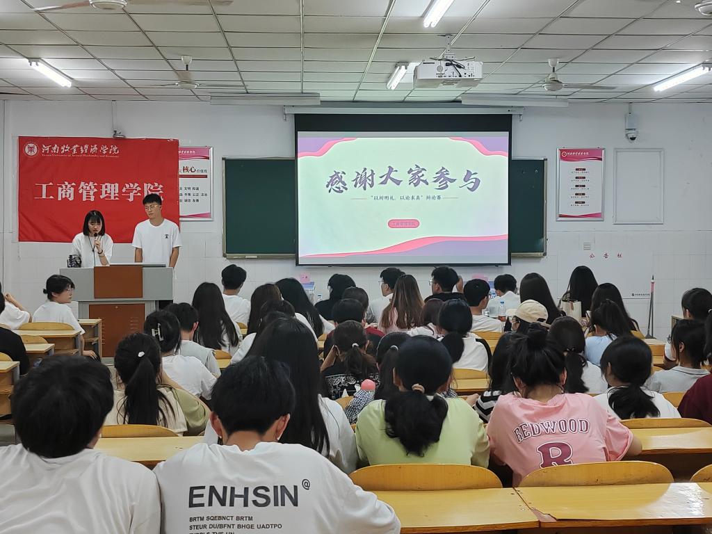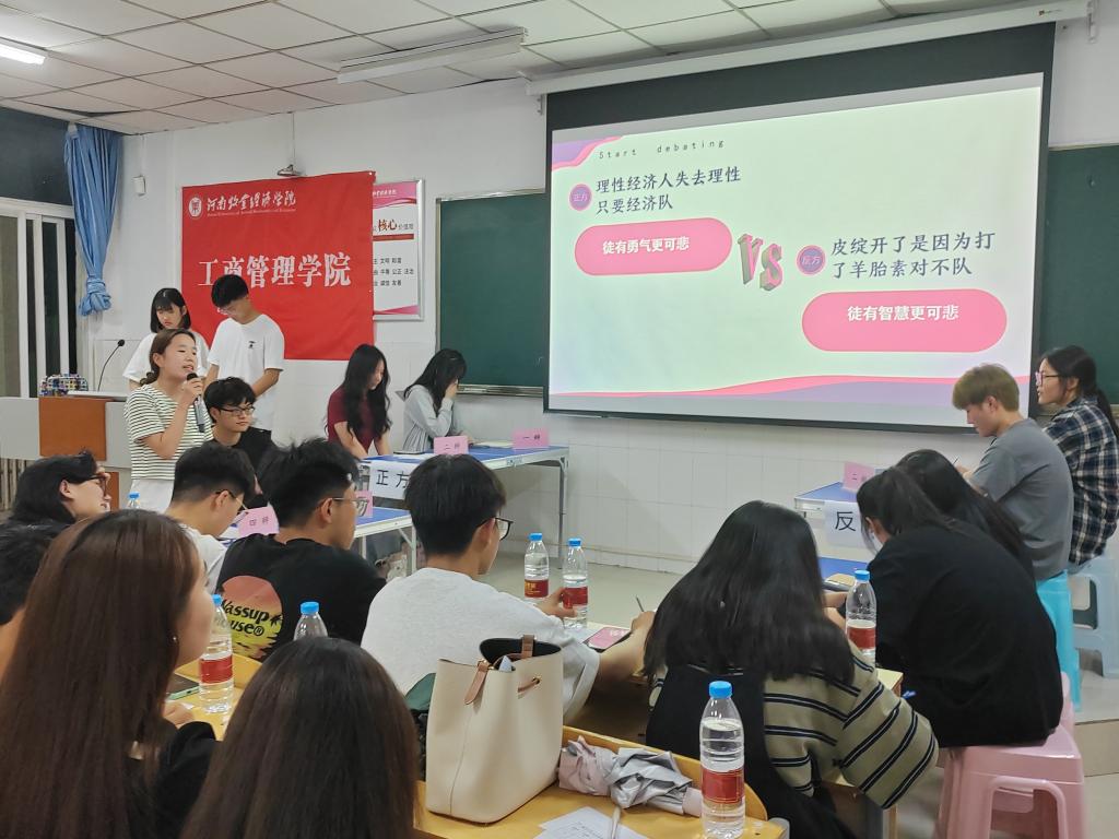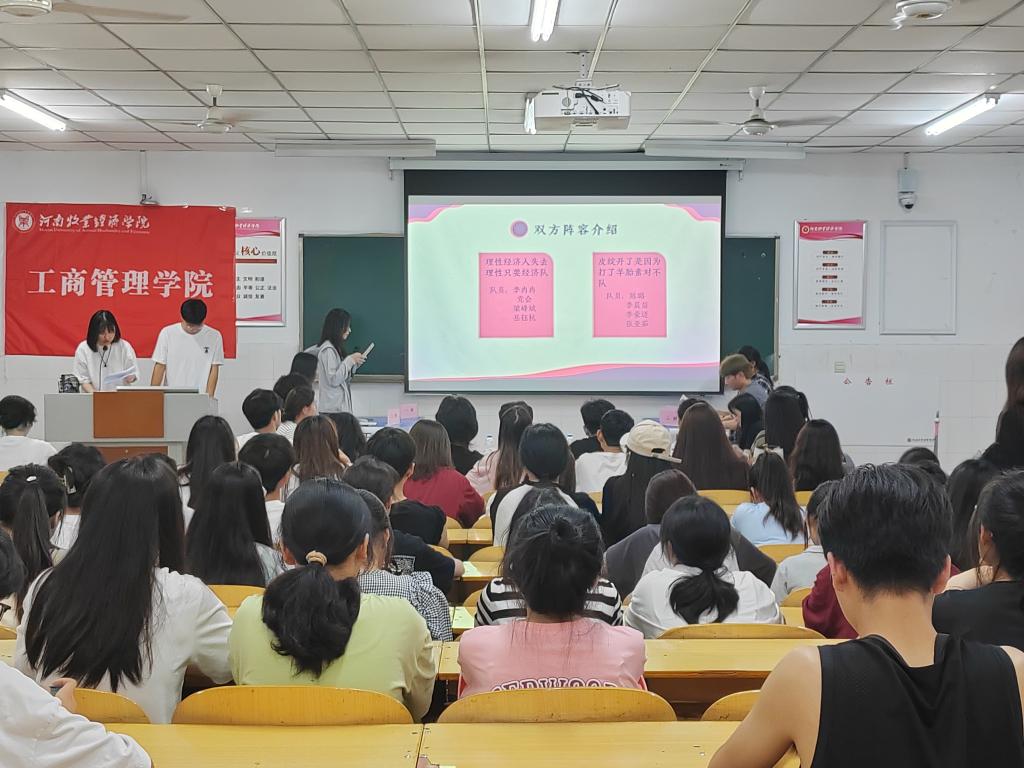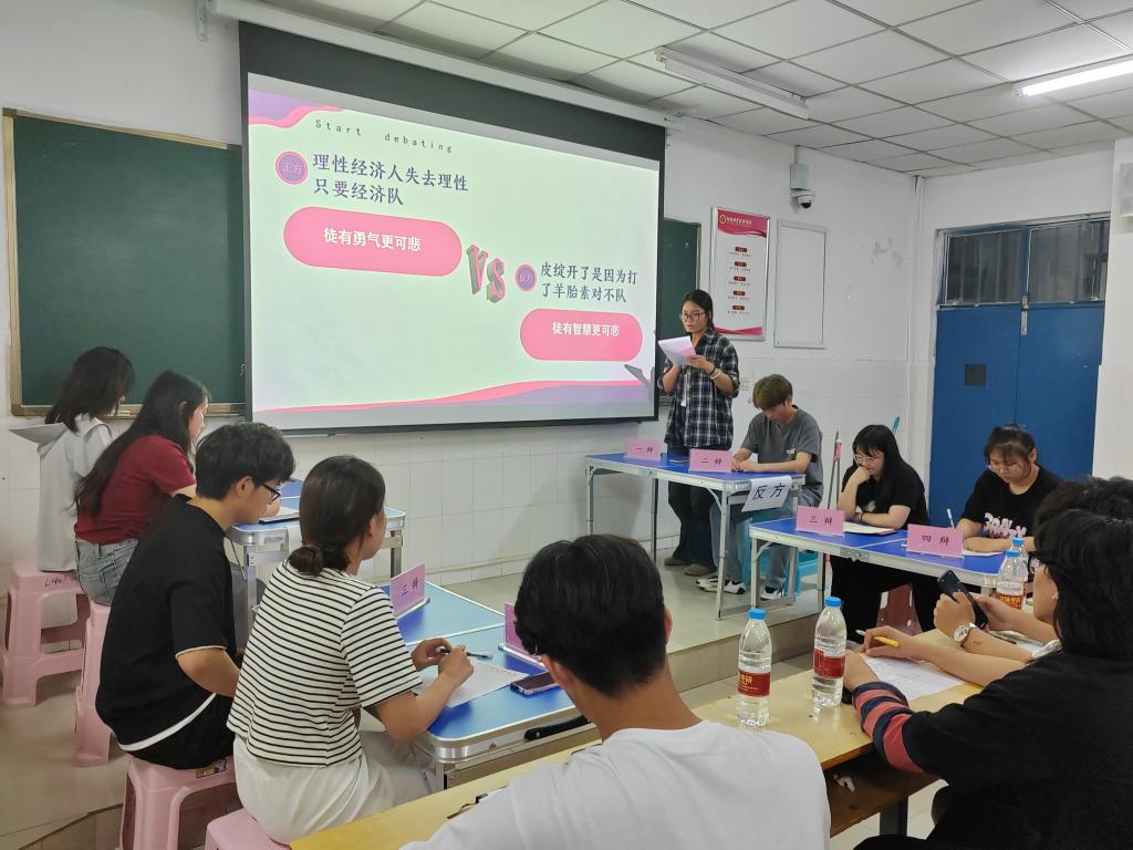 在为期一个月的比赛时间里,先后有15支队伍参与该比赛,经过激烈角逐,最终21营销02班的“理性经济人失去理性只要经济队”和22工商02班的“皮绽开了是因为打了羊胎素对不队”进入决赛。决赛中双方辩手引经据典,字字珠玑,场下观众激情澎湃,掌声连连响起。
