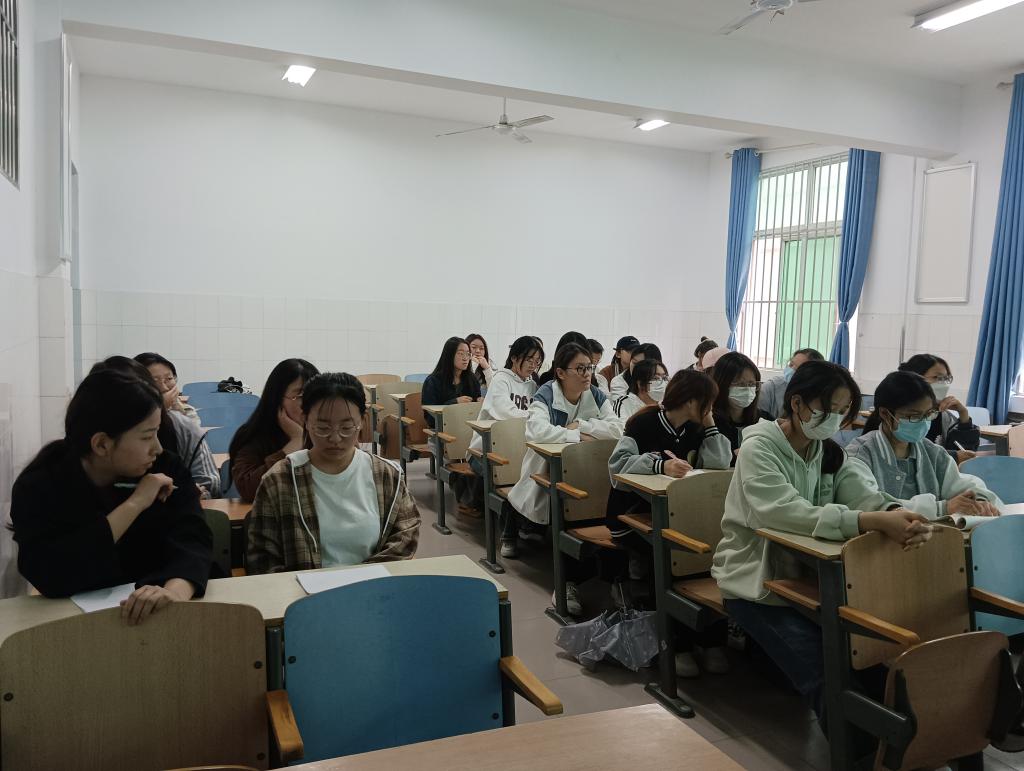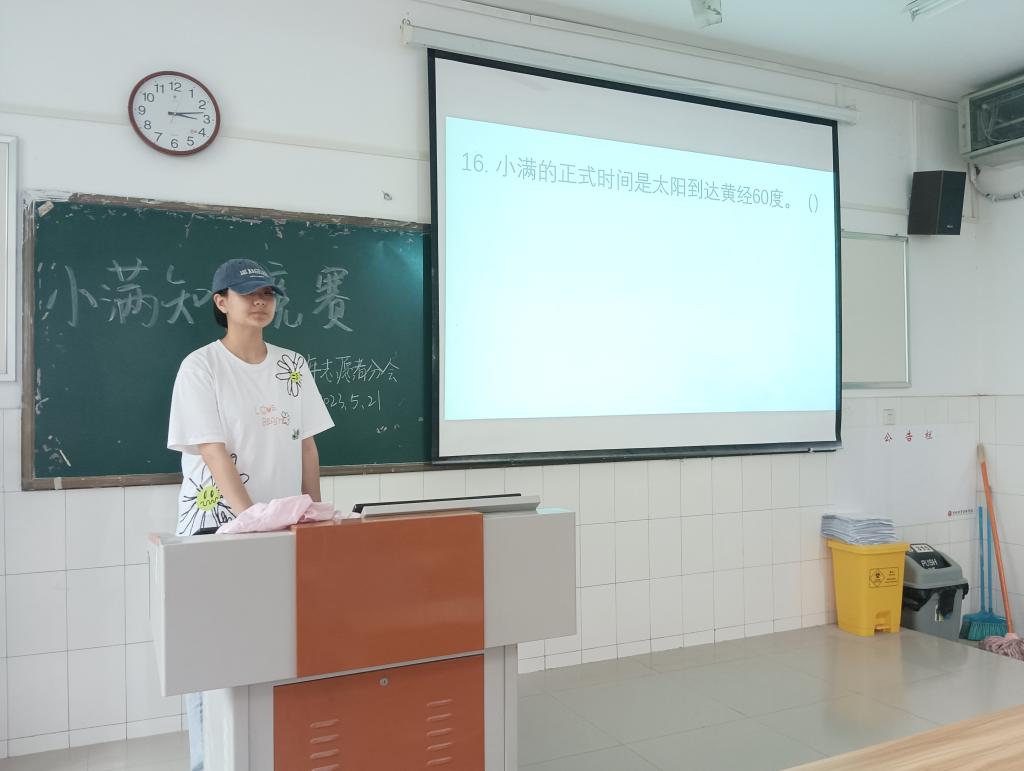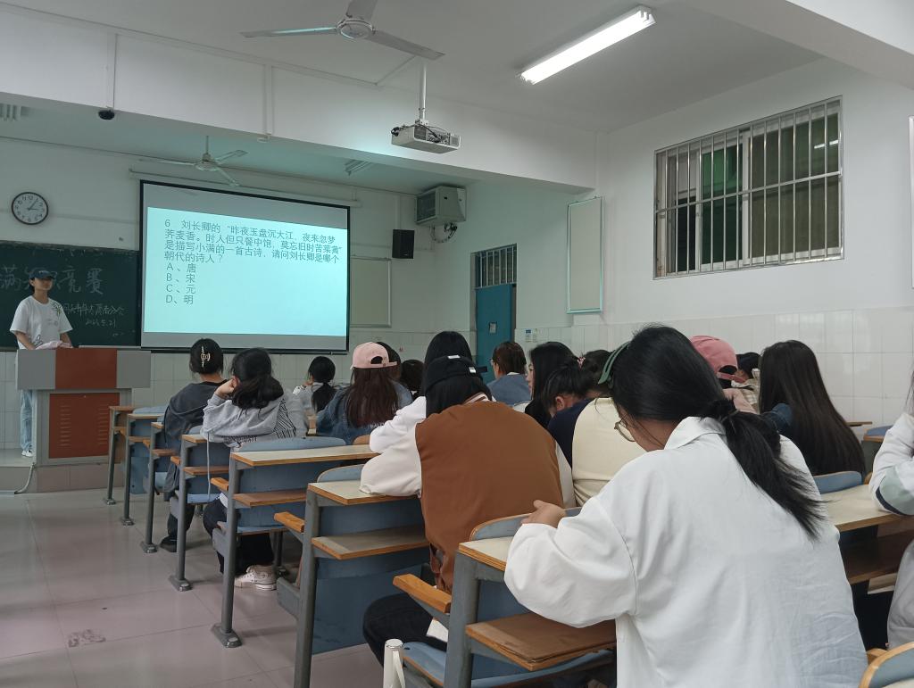 在B315教室里,知识竞赛正式开始。本次知识竞赛是一项旨在检验参赛者对小满这一节气的综合知识的比赛活动。本次竞赛通过展示PPT来进行,参赛者需要根据PPT中的内容写出答案并将纸张交给主持人。主持人会对答案进行评分,每个参赛者都十分认真地思考和回答问题,没有人松懈。一些在场的观众也都被参赛者们高超的表现所折服。