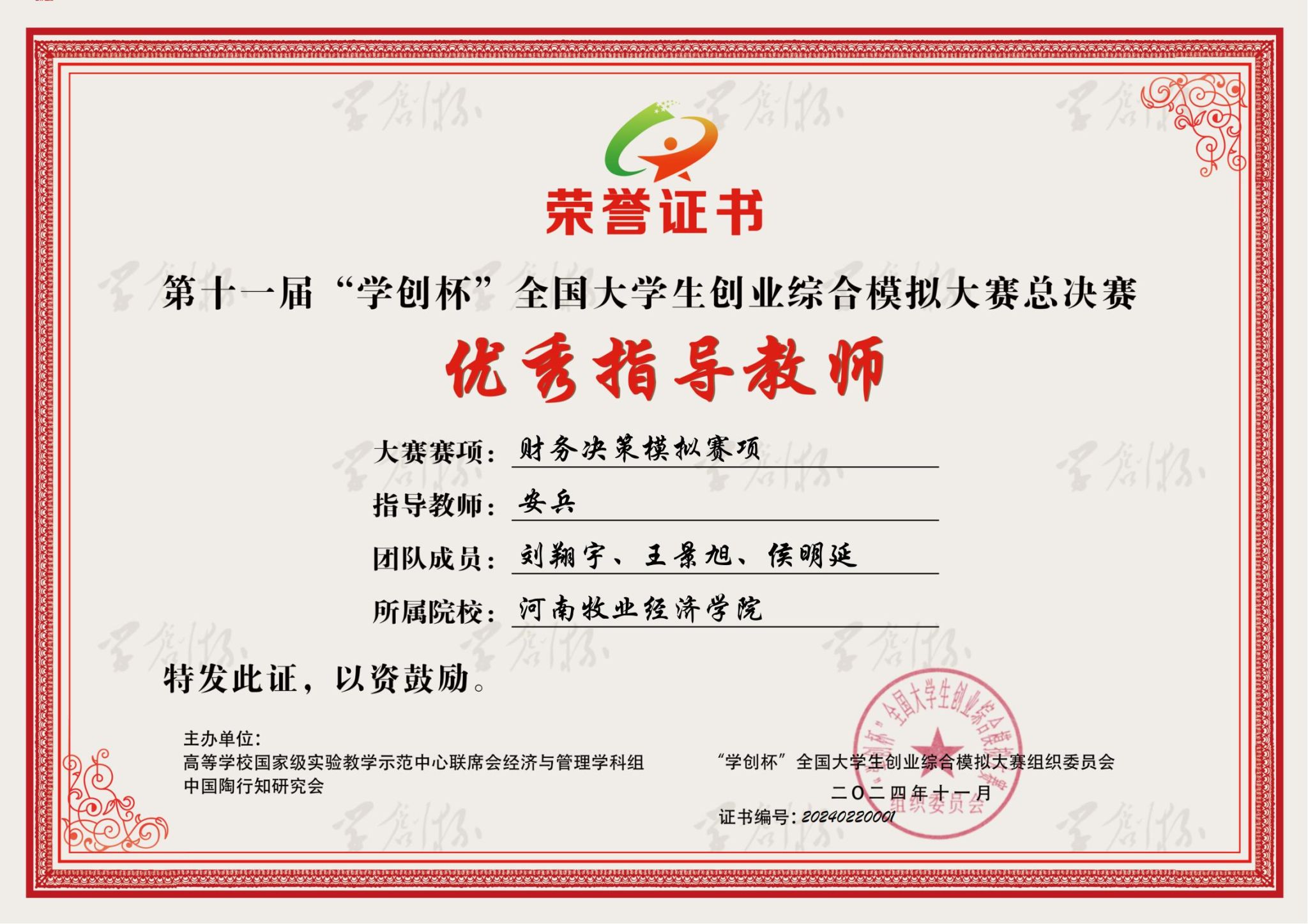 本次大赛由高等学校国家级实验教学示范中心联席会经济与管理学科组、中国陶行知研究会主办,徐州医科大学承办。本届“学创杯”创业综合模拟大赛全国总决赛,吸引来自全国172所高校242支本科参赛队伍同台竞技。各参赛团队经过激烈角逐,我校刘翔宇、王景旭、侯明延同学组成的凌云队,在ok138cn太阳集团古天乐安兵老师的带领下,不畏强手,与多所双一流高校展开比拼,获得“财务决策模拟”赛项一等奖,安兵老师获得“优秀指导教师奖”。
