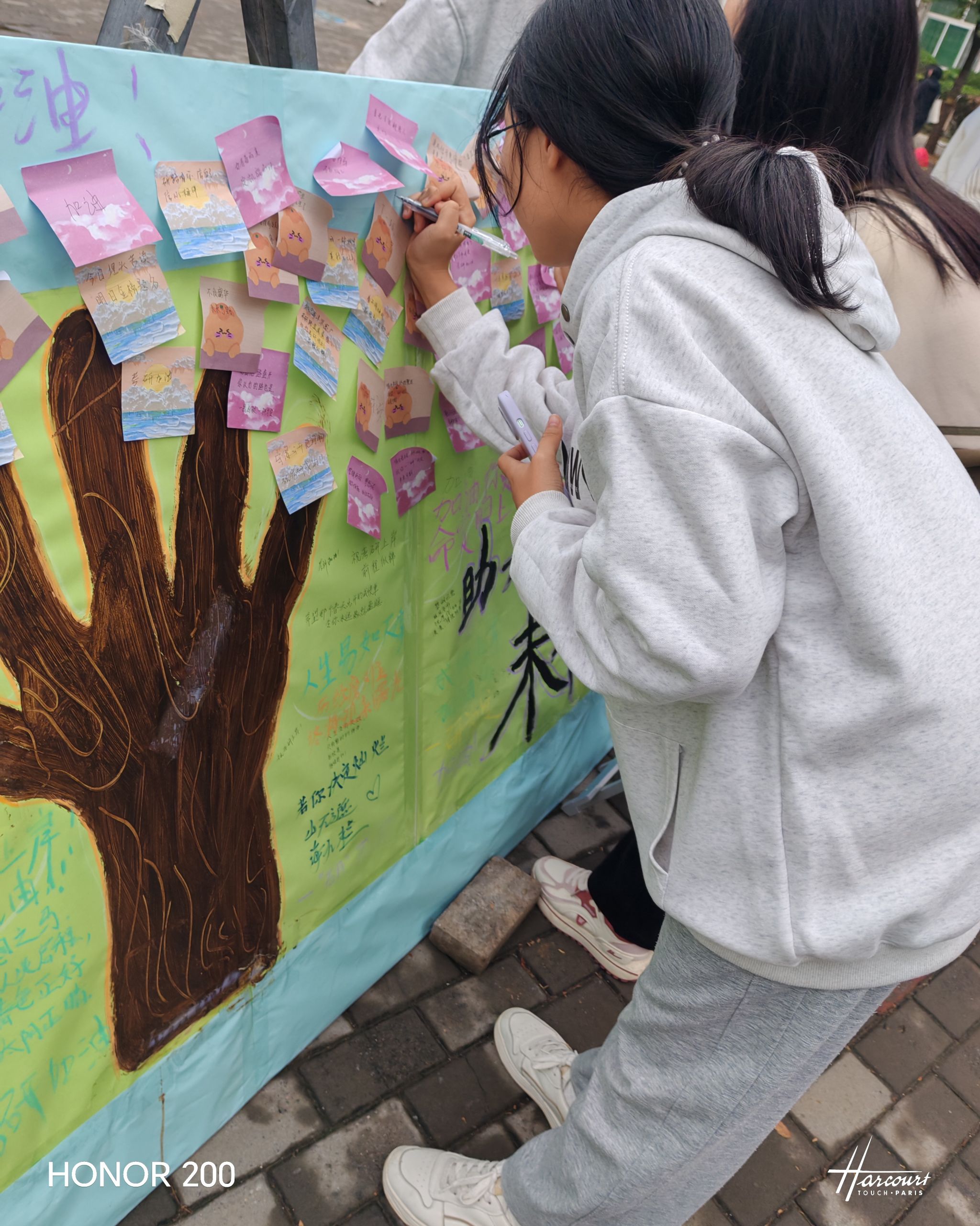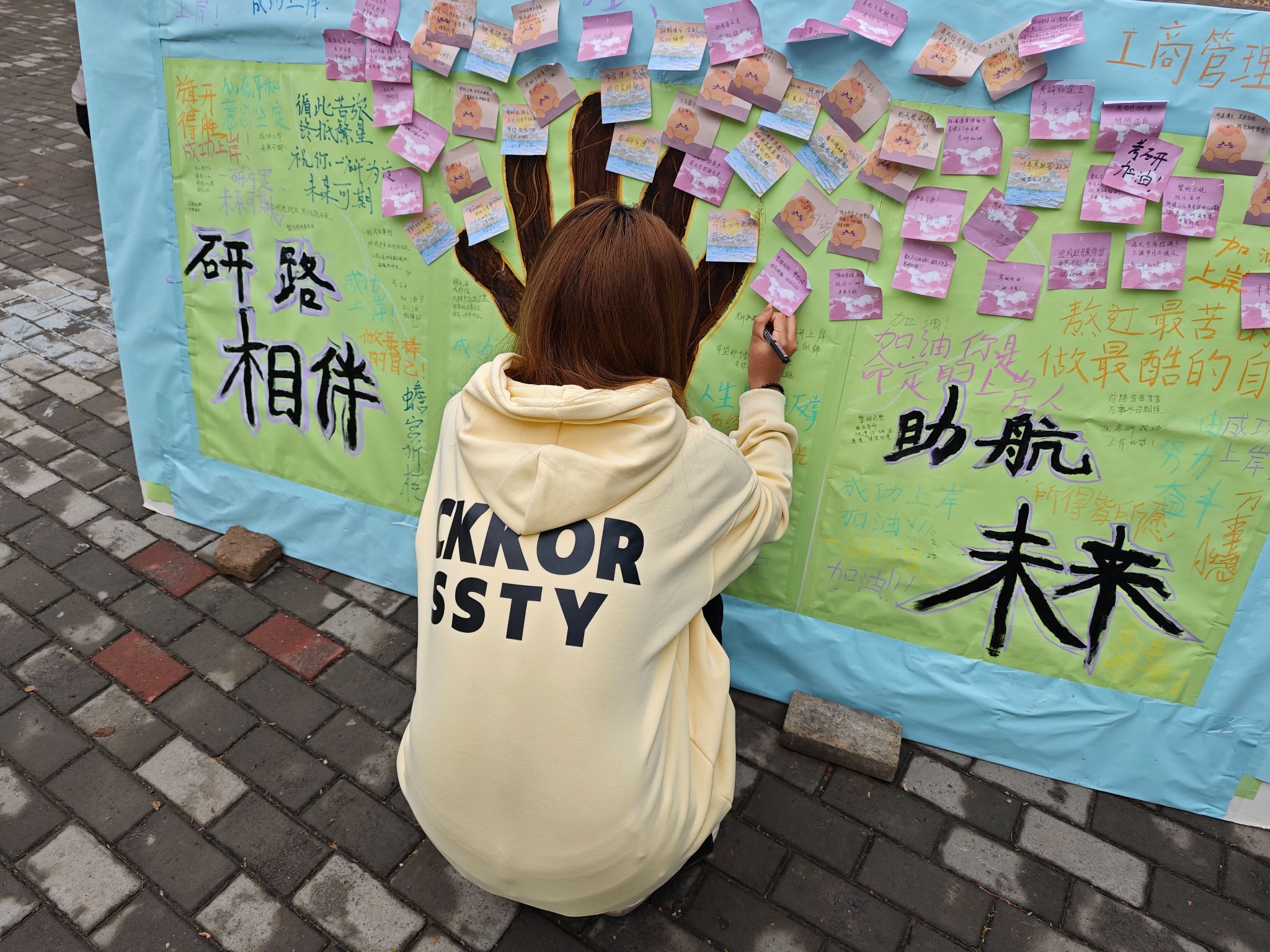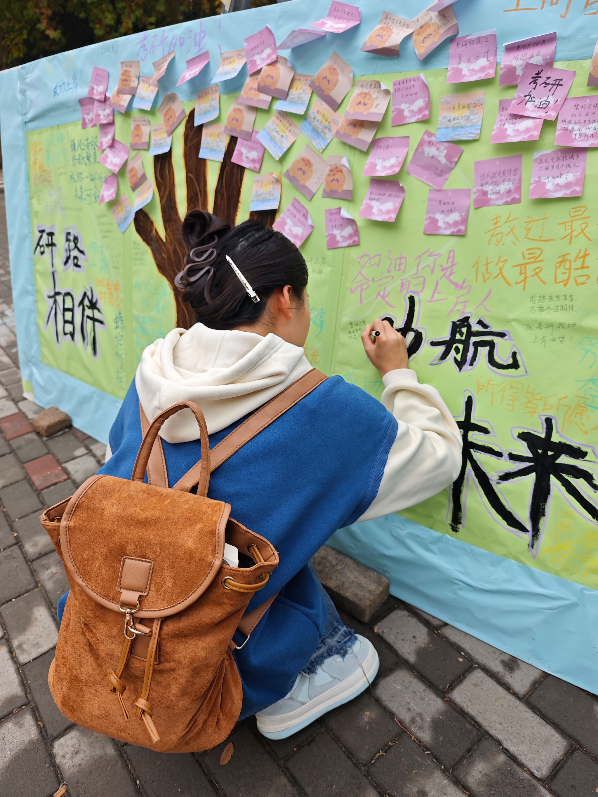 活动一经开展便获得了同学们的积极响应。本次活动由两个环节组成:写心愿种下“心愿树”,‘研’祝福浇灌“心愿树”。在第一个环节中,考研学子们在便利贴上写下了自己的目标院校和考研心愿,承载着他们对考研“上岸”的渴望和对未来生活的憧憬。紧接着,部分老师和低年级同学们参与到‘研’祝福环节,大家通过文字和图案,向考研的同学表达了真挚的祝福,传递出温暖与鼓励。最后,“心愿树”在同学们的共同装饰下完成,它成为了每一位考研学子心中的美好寄托,激励着他们在追逐梦想的道路上勇往直前。
