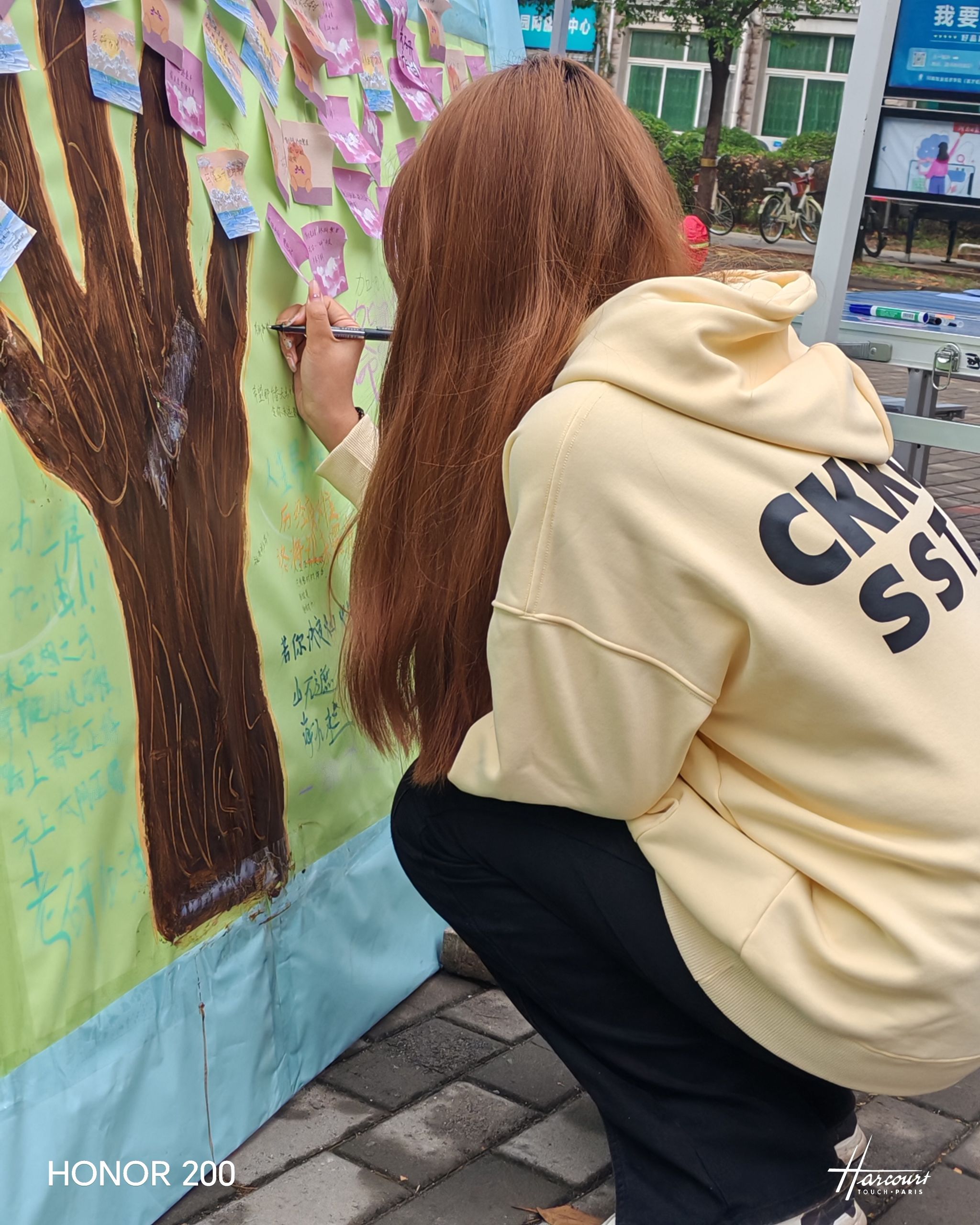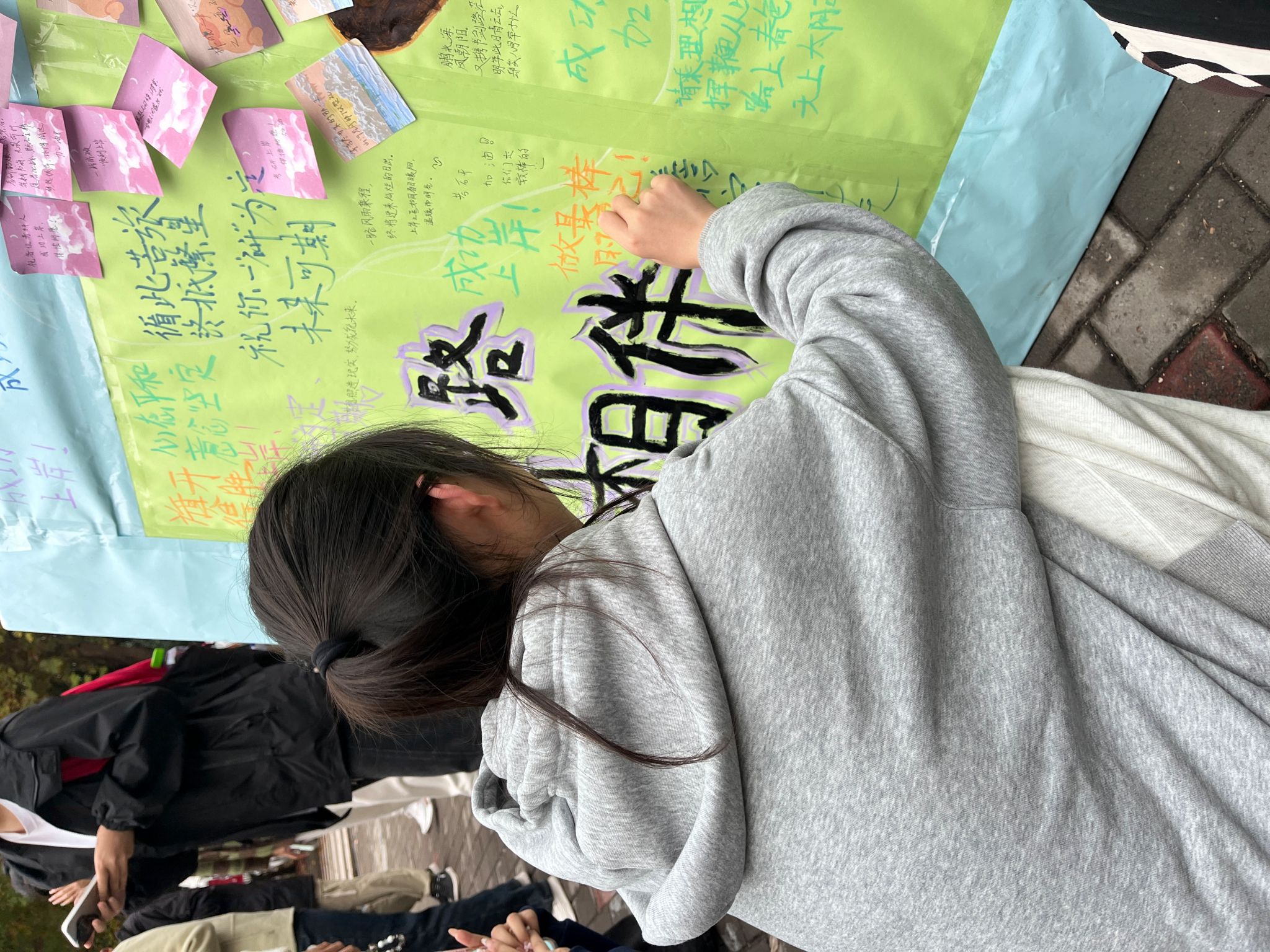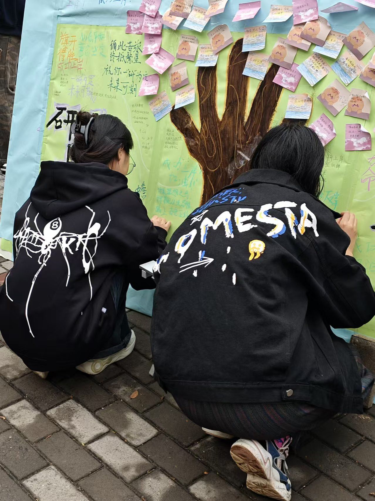 活动一经开展便获得了同学们的积极响应。本次活动由两个环节组成:写心愿种下“心愿树”,‘研’祝福浇灌“心愿树”。在第一个环节中,考研学子们在便利贴上写下了自己的目标院校和考研心愿,承载着他们对考研“上岸”的渴望和对未来生活的憧憬。紧接着,部分老师和低年级同学们参与到‘研’祝福环节,大家通过文字和图案,向考研的同学表达了真挚的祝福,传递出温暖与鼓励。最后,“心愿树”在同学们的共同装饰下完成,它成为了每一位考研学子心中的美好寄托,激励着他们在追逐梦想的道路上勇往直前。