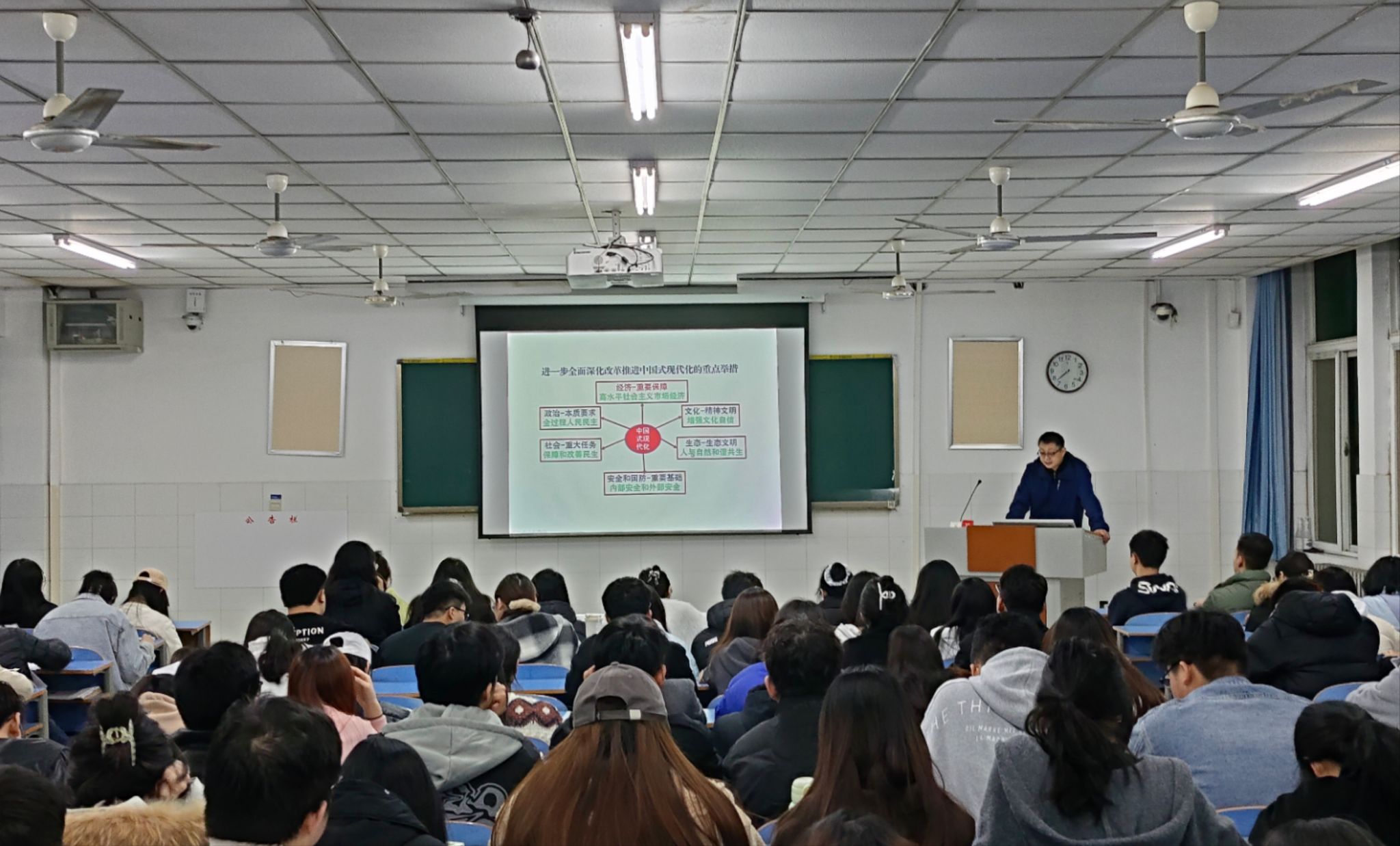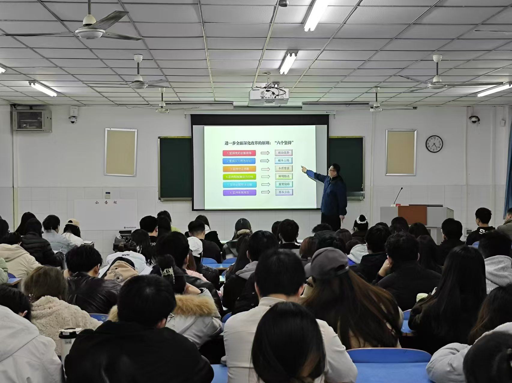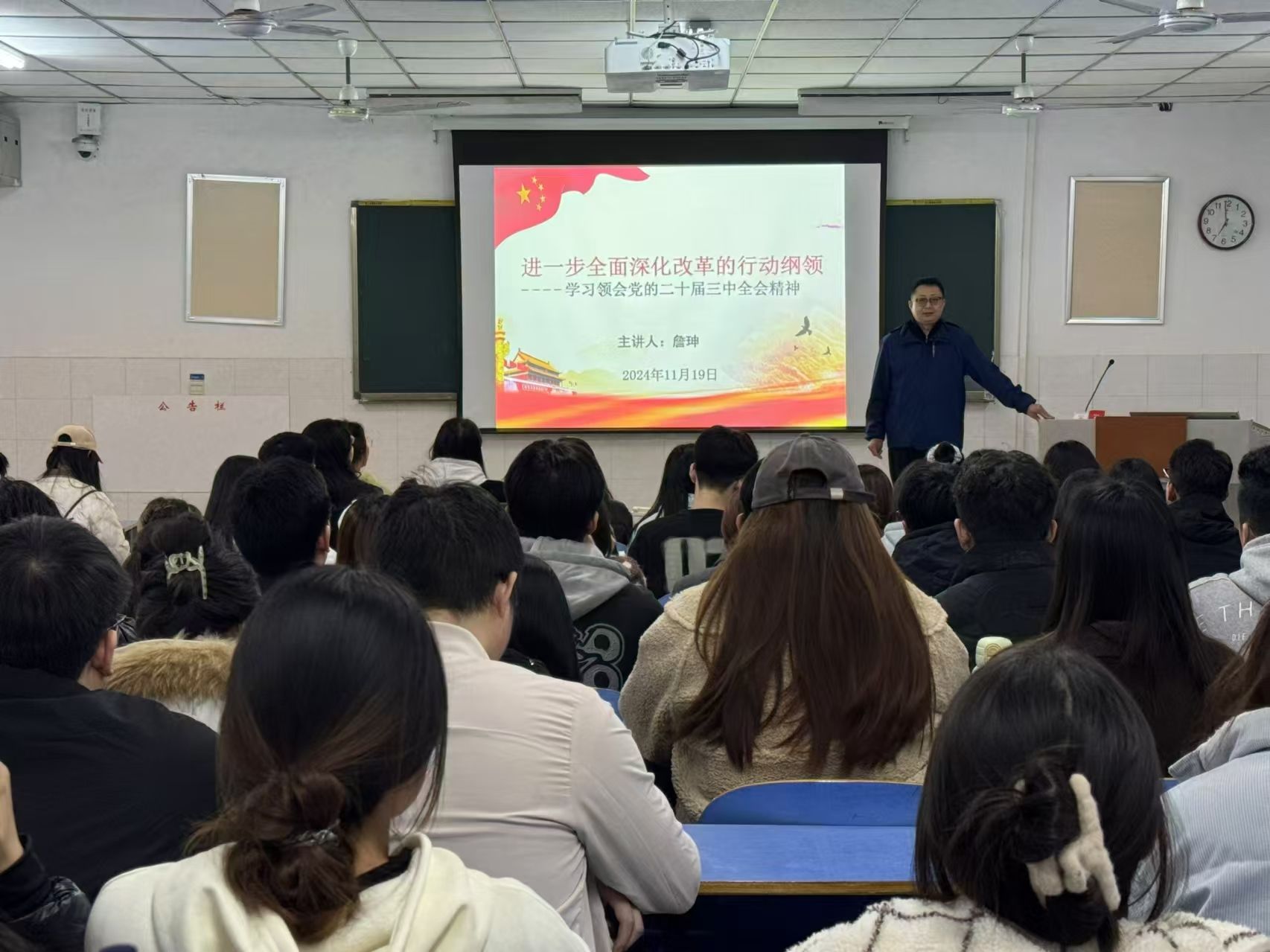 为深入学习贯彻党的二十届三中全会精神,教育引导我院全体党员和入党积极分子把思想和行动统一到习近平总书记重要讲话精神上来,根据《ok138cn太阳集团学习贯彻党的二十届三中全会精神宣讲方案》和ok138cn太阳集团古天乐具体安排,ok138cn太阳集团古天乐于11月19日晚19:00在E305开展了以《进一步全面深化改革的行动纲领--学习领会党的二十届三中全会精神》为主题的宣讲会,宣讲会由ok138cn太阳集团古天乐党委副书记詹珅主讲,全体学生党员、党员发展对象及2024下半年入党积极分子约190人参加会议。