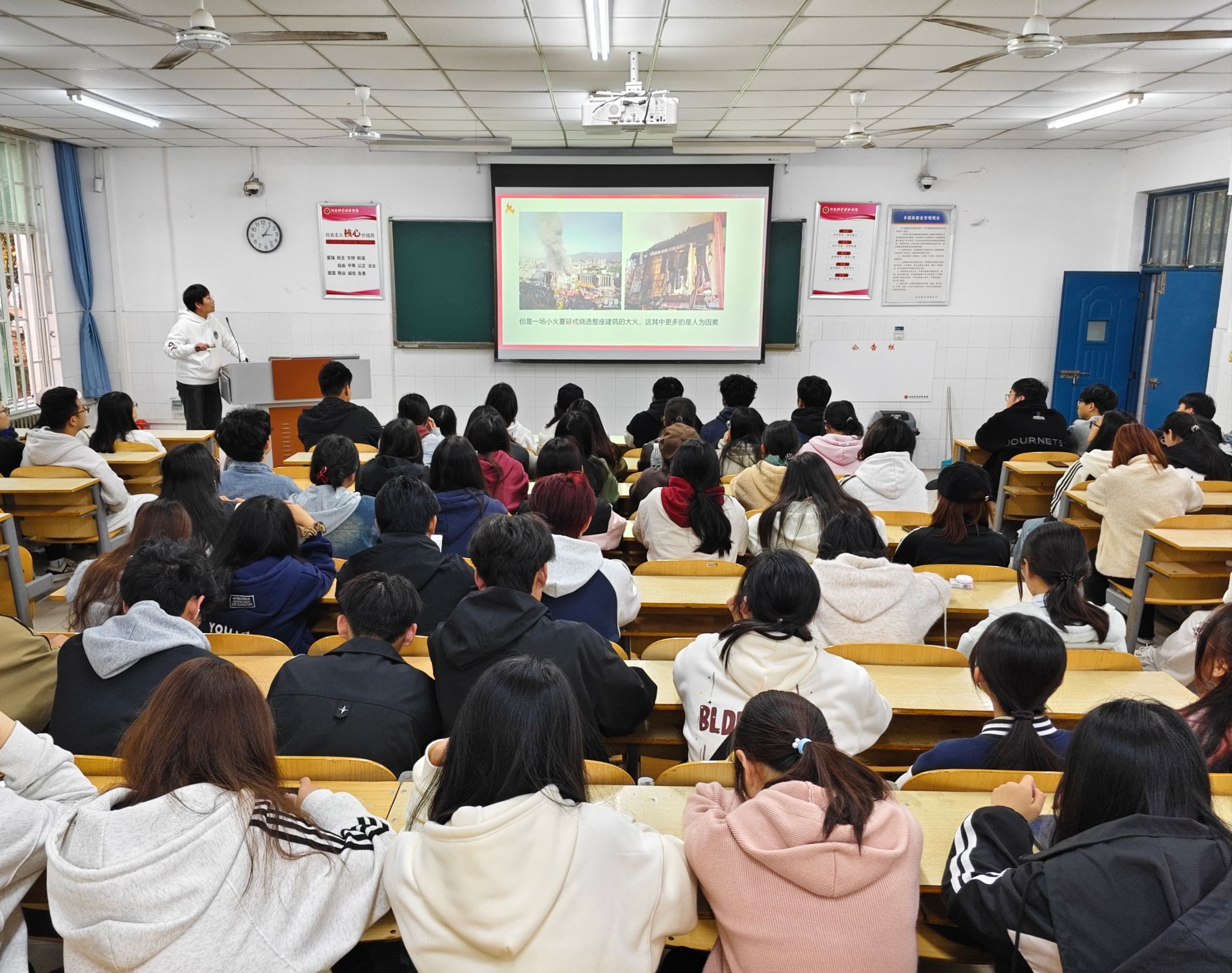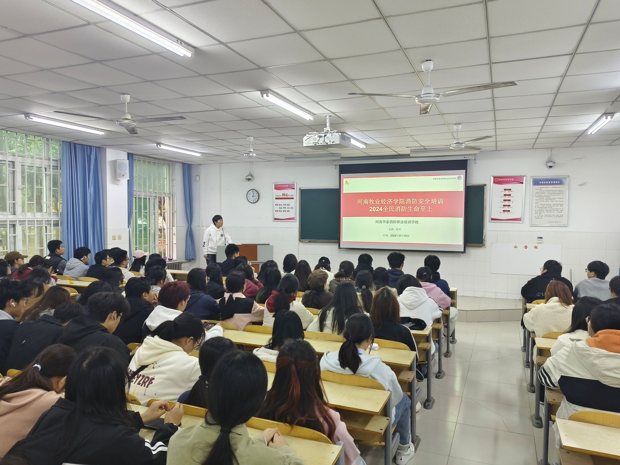 为进一步贯彻落实2024年消防宣传月主题“全民消防,生命至上”,增强学生消防安全意识,提高突发事件的应变能力,有效预防火灾事故的发生,ok138cn太阳集团古天乐于11月15日在W103教室开展以“隐患险于明火 防范胜于救灾”为主题的消防安全知识讲座。本次讲座特邀河南华泰消防职业培训学校讲师、国家一级注册消防工程师赵平老师主讲,学院一百余名同学参与。