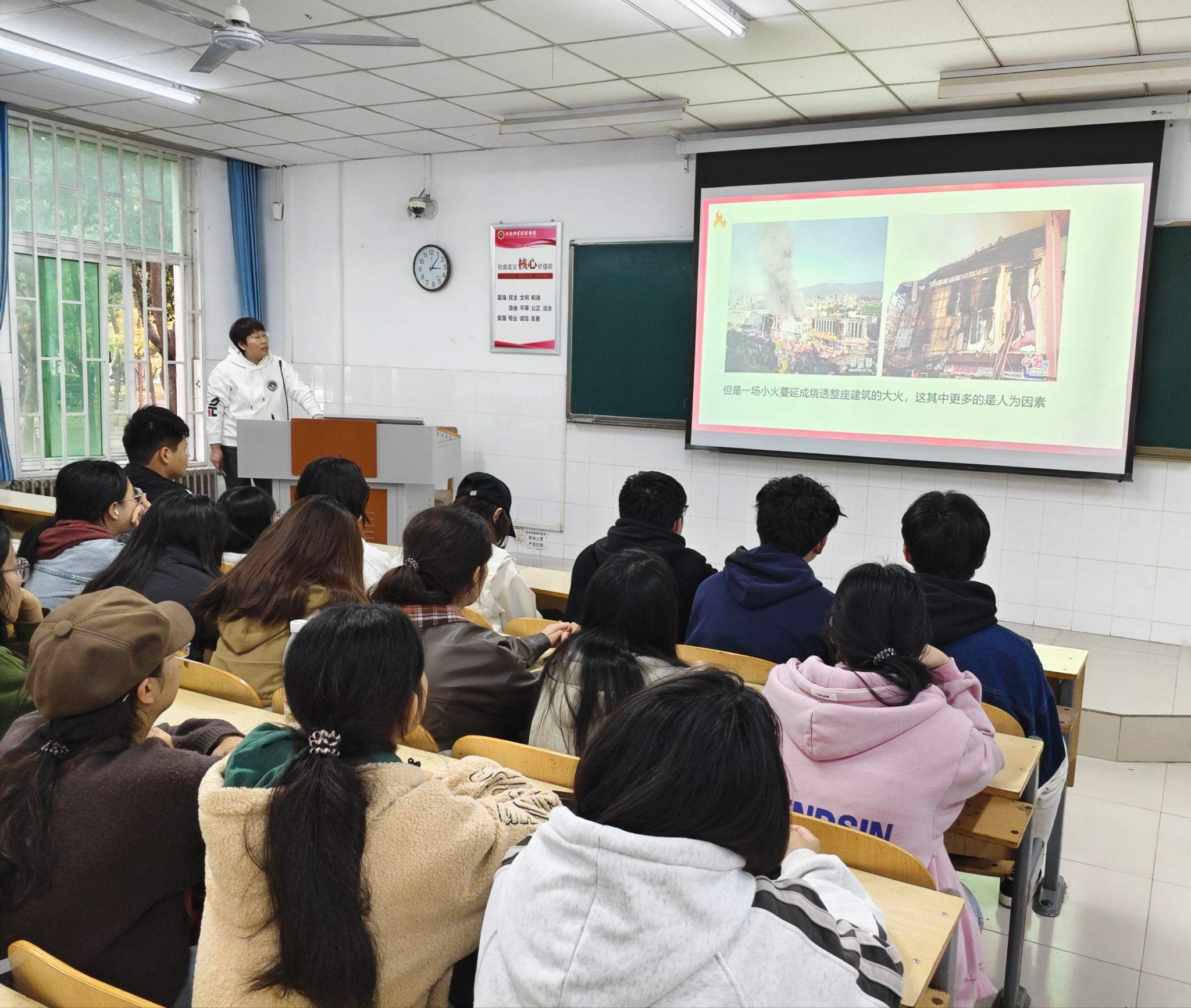 讲座伊始,赵平老师通过最新的学校火灾案例分析展开讲解,通过播放火灾事故和如何分辨及正确使用灭火器的片段,使学生对消防安全有了进一步的认识和掌握。随后,赵平老师从校园宿舍消防安全的特点出发,为学生讲述了用火用电安全、宿舍限电、插线板的使用及违规电器的禁止。讲座的互动环节,同学们积极提出自己的疑问,与赵平老师进行了深入的交流与讨论,这也有助于同学们更好地记住消防安全知识。赵平老师还呼吁同学们积极宣传消防安全意识,更好地预防火灾的发生。最后,赵平老师再一次强调了消防安全在日常生活中的重要性,并呼吁大家正视火灾的潜在威胁,积极采取措施进行预防。同学们纷纷表示通过本次讲座学习到了许多实用的消防安全知识和应对火灾的技能。