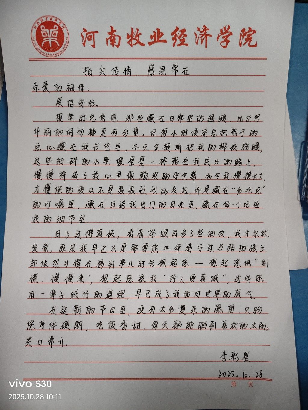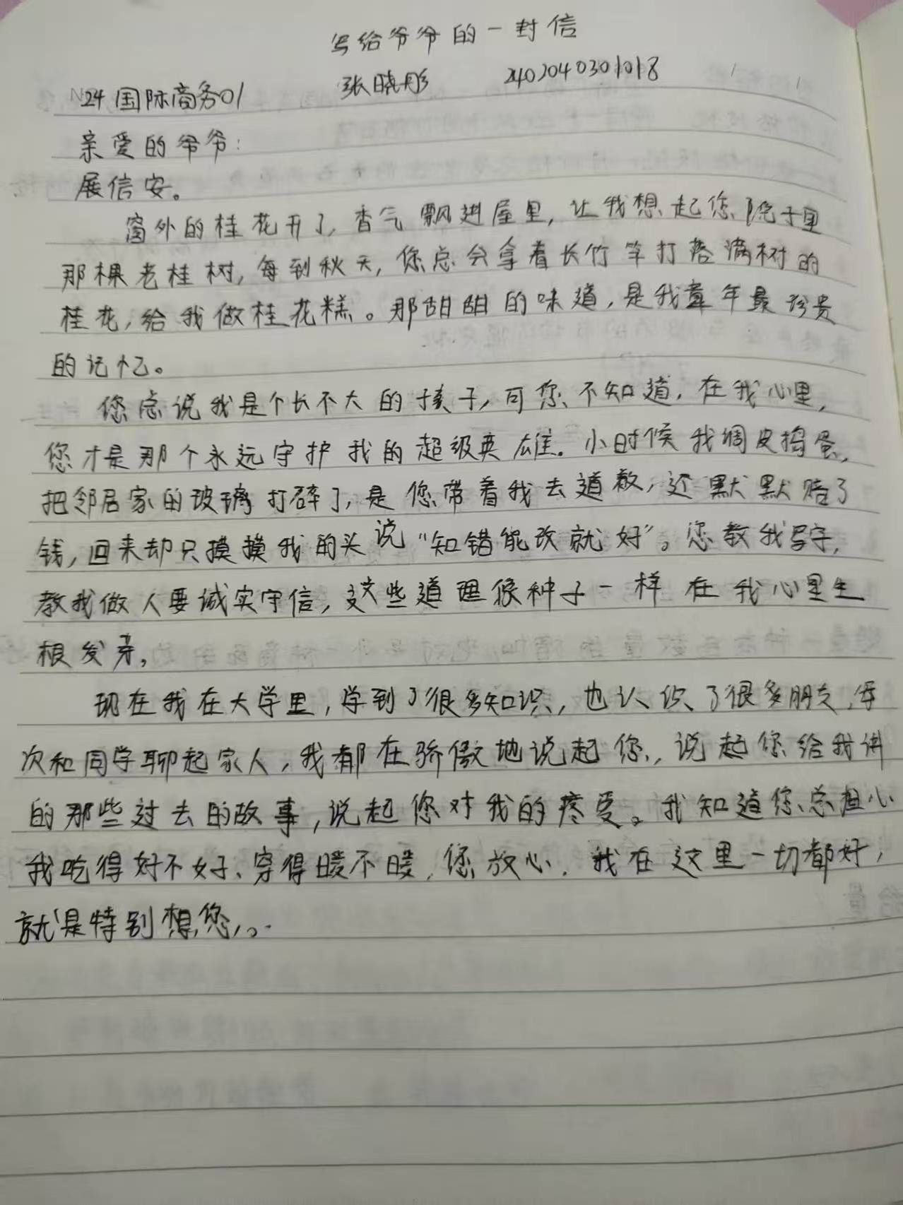 活动一经发布就得到同学们的积极响应。大家充分发挥创意与才艺,借助多种方式动手制作感恩贺卡。制作期间,同学们都不由自主地回忆起和长辈相处的点点滴滴,那些温暖的瞬间、悉心的教导,都成了他们创作的灵感来源。每一份贺卡都各有特点,有的简洁大方,有的华丽精美,不过无一例外,都体现着同学们对长辈深深的感恩与祝福。那一张张略显稚嫩却无比真诚的贺卡,传递着浓浓的亲情。除了制作感恩贺卡,撰写书信也是本次活动的一大看点。同学们静下心,拿起笔,把内心深处对长辈的感激之情化为一行行文字。在书信里,他们回忆着长辈的关爱与付出,从生活中的细微之处到成长路上的重要指引,每一个细节都饱含深情。同学们用真挚的语言、流畅的表达,将感恩之情缓缓道来,让人读后十分动容。