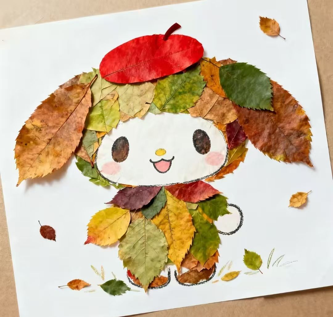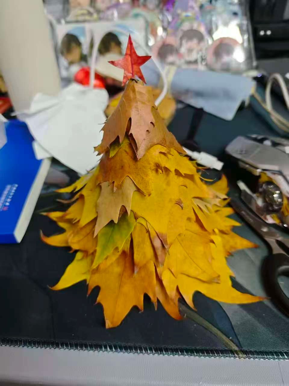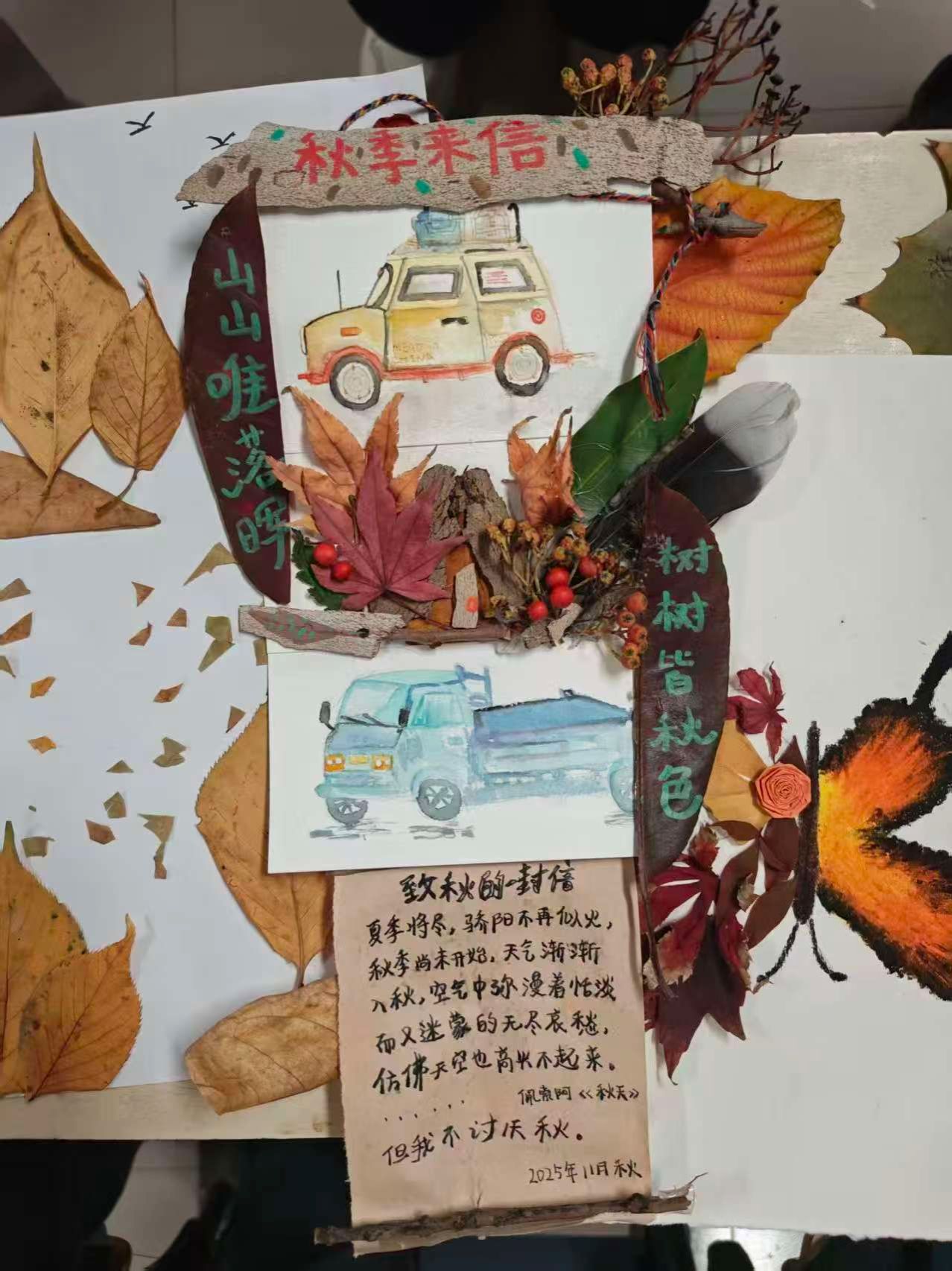 活动期间,往日里匆匆穿梭于校园的同学们纷纷放慢脚步,驻足在落叶堆积的角落。大家弯腰挑选形态、色彩心仪的落叶,原本静默的校园秋景图,瞬间变成了一幅流动的青春画卷。活动现场,同学们各展创意:有的细心拂去落叶上的尘埃,将其夹入书中,借助时光与压力将叶片最美的色彩定格成永恒的书签;有的则拿起剪刀、画笔,对落叶裁剪拼贴,结合彩绘与文字创作出独具匠心的“秋日寄语”——梧桐叶成了少女的裙摆,碎叶拼出一只灵动的小猫,创意与巧思在指尖流淌,平凡的落叶进行着从自然造物到艺术作品的华丽蜕变。同学们不仅是在制作一件手工艺品,更是在与自然对话,与季节唱和。此次活动以轻量化、创意化的方式,将环保意识、美学教育与志愿精神相结合。同学们在拾叶、制作、合影的过程中,不仅锻炼了动手能力与创新思维,也在温馨的氛围中缓解了日常压力,增强了对校园环境的关注与爱护。