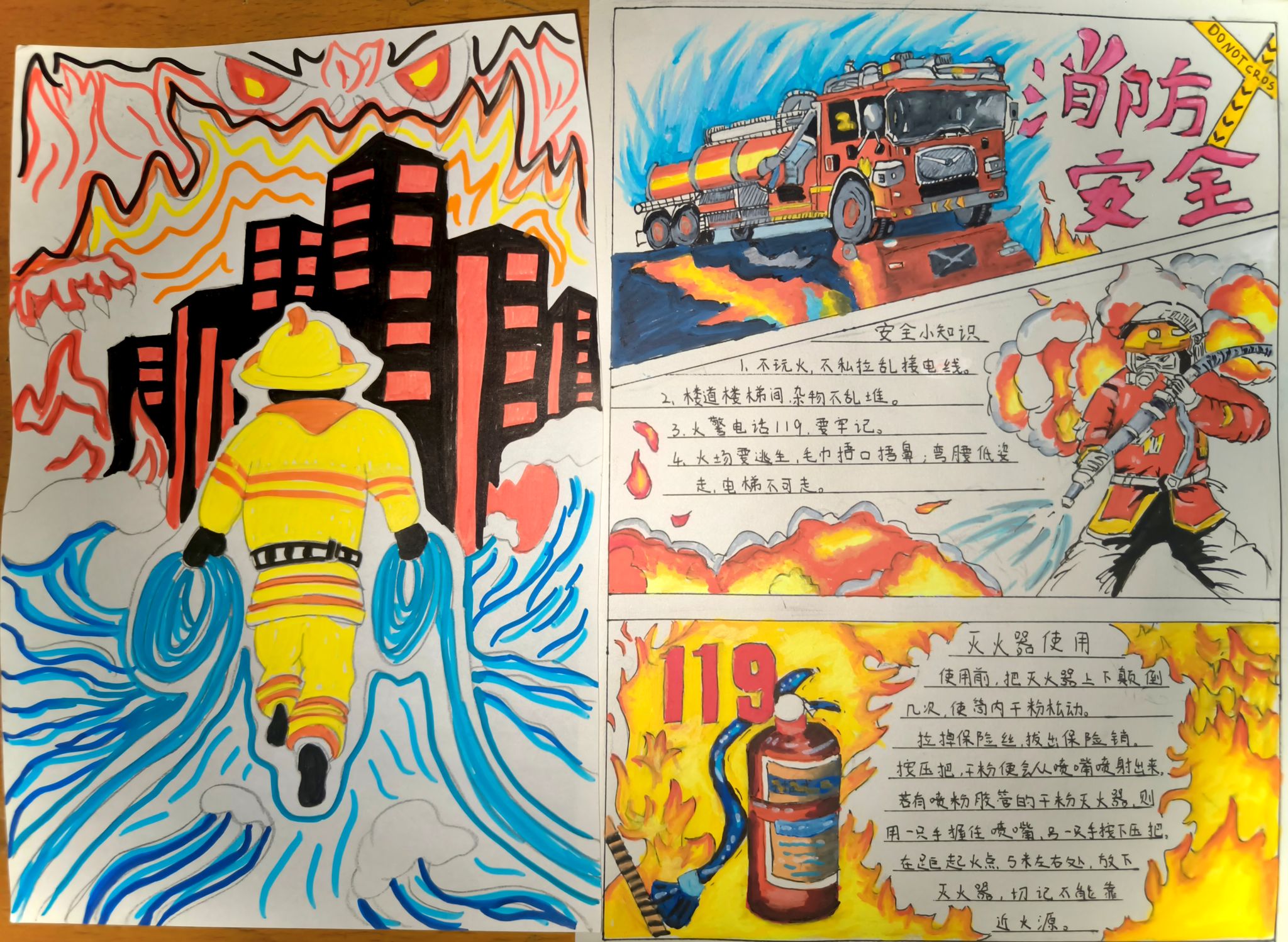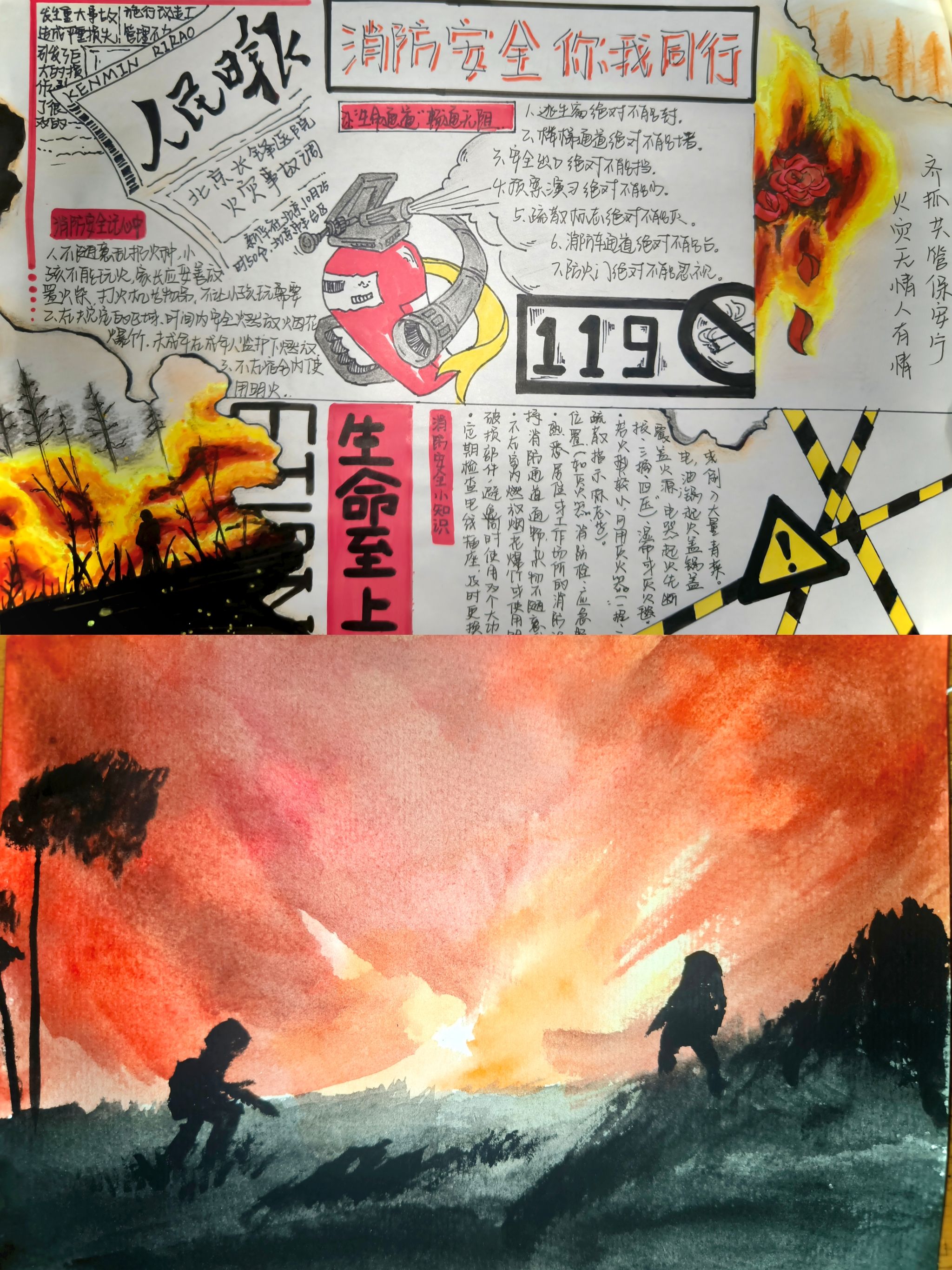 活动期间,同学们以手抄报、绘画等多种形式进行原创创作,将消防安全知识生动融入作品之中。作品内容涵盖典型校园火灾案例剖析、常用应急设备操作指南、校园逃生路线设计等多个方面。学生通过自主查阅资料、动手实践,全面而系统地掌握了消防安全的核心要点与技能。在创作过程中,同学们不仅锻炼了动手能力与创新思维,更实现了从被动接受安全知识到主动传播安全理念的重要转变。这种以创促学、以作促思的方式,有效营造出“人人关注消防、人人参与消防”的浓厚氛围。活动还设置了互动展示环节,学生通过分享创作心得,在交流中进一步巩固和深化了对消防安全知识的理解,同学们纷纷表示将把掌握的消防安全知识和技能运用到实际生活中,自觉承担起维护校园安全的责任,共同筑牢校园安全的“防火墙”。