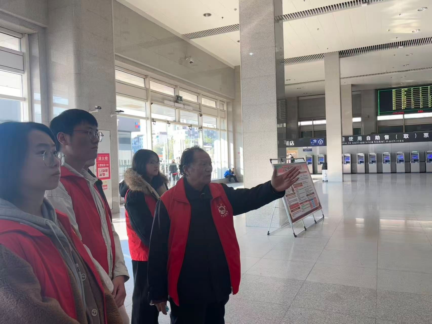 活动期间,志愿者们以饱满的热情迅速投入服务工作。大家严格按照雷锋服务岗的值班要求,轮流在岗值守,主动为过往旅客提供帮助:看到携带大件行李的旅客,便上前协助搬运;遇到因路线不熟而迷茫的旅客,耐心查询车次信息、指引检票口与换乘通道;对老年旅客、残障人士等特殊群体,更是全程贴心陪同,帮助他们顺利完成购票、进站等流程。志愿者们的细致服务,不仅为旅客解决了实际难题,也让奔波的旅途多了一份温暖,赢得了过往旅客的一致好评。