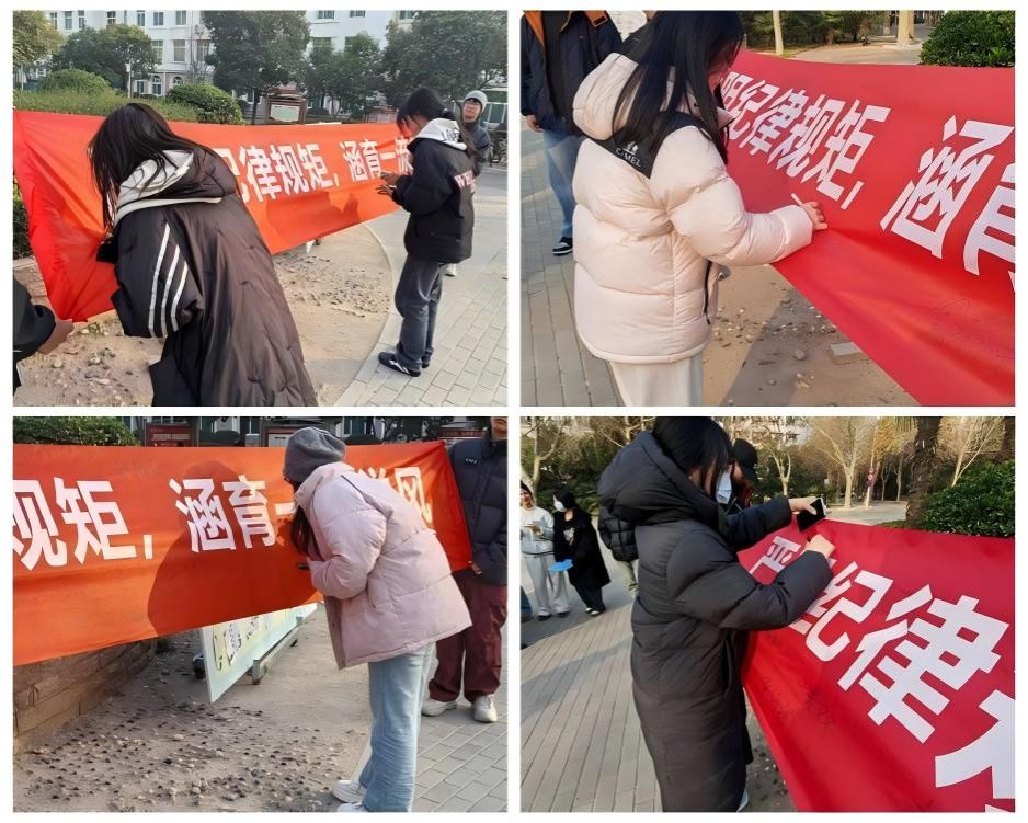 活动现场,红色条幅的标语用简洁有力的文字清晰传达出学风建设的核心要求。在签名环节,同学们有序上前郑重签下自己的名字。这一笔,写下的不只是简单的字迹,更是对自我成长的严格要求、对集体进步的坚定承诺,更是助力学院学风建设迈向新台阶的使命担当。现场氛围严肃而热烈,同学们以认真的姿态铭记使命,展现出投身学风建设的坚定决心与良好风貌。
