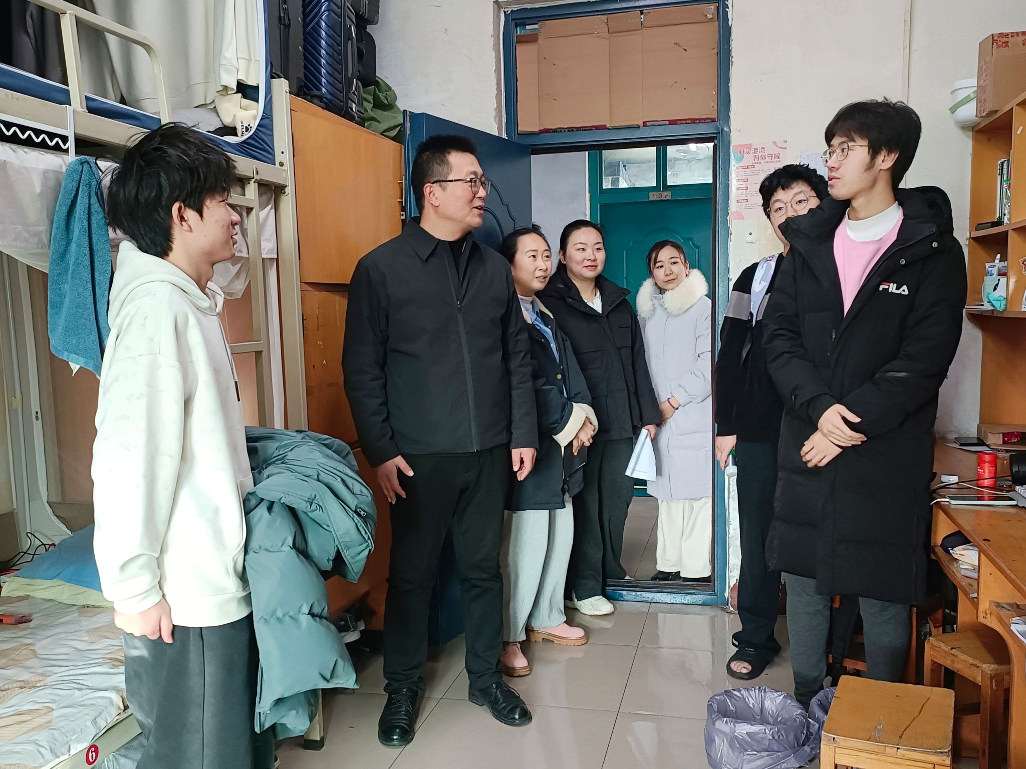 走访过程中,马永生副书记与辅导员们重点关注以下工作:一是持续落实“楼长-楼层长-宿舍长”三级夜间巡查机制,引导学生养成按时熄灯、保持安静的良好作息习惯,合理安排复习时间,以饱满状态迎接考试;二是扎实推进无烟宿舍与无烟校园建设,通过“党员+班干部+宿舍长”日常检查与学工队伍随机抽查相结合的方式,加强学生公寓禁烟宣传与监督,共同维护健康、安全、文明的宿舍环境。