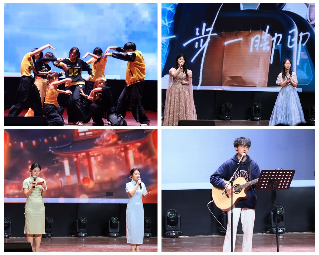 活力四射的爵士舞《Diamond》率先点燃全场气氛;深情款款的歌曲《我是真的爱上你》《安和桥》引人共鸣;校Kpop队与街舞队带来的《O.O》《Nobody Knows》动感十足,展现了青春的张扬与力量。25级物业01班陈泽一同学的吉他弹唱《可不可以》清新真挚,24级工商01班王彦涵同学的独唱《晚安》温暖动人,赢得阵阵掌声。