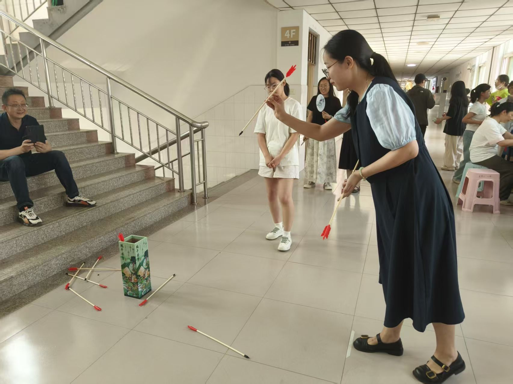 活动现场划分为“匠心”“雅趣”“竞合”三大体验区,60余名师生在协作中深化文化认同:匠心工坊:巧手赋新意。香囊制作区十味草药清香弥漫,教职工飞针走线缝制“安康福袋”。曹迪老师感慨:“一针一线不仅是手艺,更是将‘祈福避疫’的古人智慧传递给下一代。”香扇绘制区,师生以端午草木为题材创作水墨折扇,学院学生志愿者现场指导晕染技法,将“扇引清风”的文人雅趣融入生活美学。古礼竞技:修身强体魄。“射五毒”靶前,弓箭破空直指毒虫图案,寓教于乐传递健康理念;“投壶”区参与者屏息凝神,5箭3中的“雅士”可获得定制书签。学院副院长何丽娜(主持行政工作)点评:“这些项目兼具礼仪教化与体育精神,正是‘着力改善民生’的生动实践。”欢乐协作:聚力润人心。“盲人敲锣”的欢笑声中,同事语音引导蒙眼者穿越障碍;“钓粽子”磁铁鱼竿上下翻飞,团队策略决定积分高低。赵趁老师表示:“协作游戏缓解了近期天天修改毕业论文的工作压力,让我们找回童心,更感受到‘家文化’的温暖。”