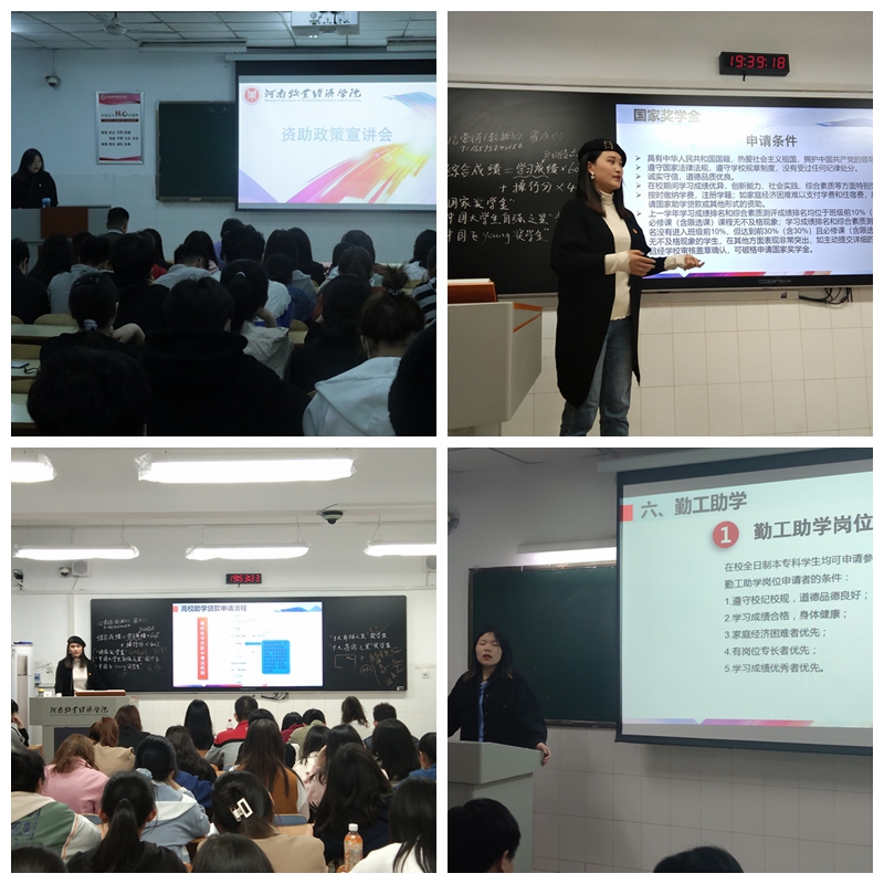 4月14-16日,我院利用晚自习时间组织两位学生资助宣传大使深入各班级开展资助政策宣讲近10场。宣讲会上,两位学生资助宣讲大使向大家详细介绍了我校“奖、助、贷、勤、减、补”六位一体的学生资助工作体系,并采取现场互动的形式解答同学们的疑问。宣讲结束后,不少学子纷纷表示,此次活动不仅进一步增进了同学们对国家、学校资助政策的了解,也让家庭经济困难的学子打消了经济上的后顾之忧,能够安心的专心学业。