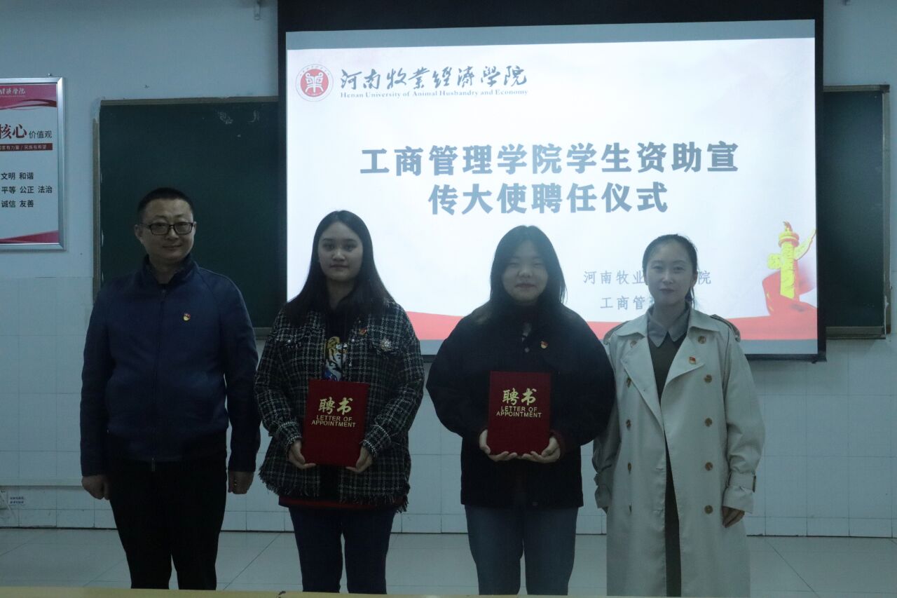 活动伊始,资助专干贾雪向在座的同学们介绍了我院两位学生资助宣传大使翟海利、乔艺的优秀事迹并号召同学们以她们为榜样,希望同学们在受助中懂得感恩,在自助中牢记责任,在助人中学会奉献。随后,院资助专干詹珅宣读了聘任决定,并向两位学生资助宣传大使颁发聘任证书。