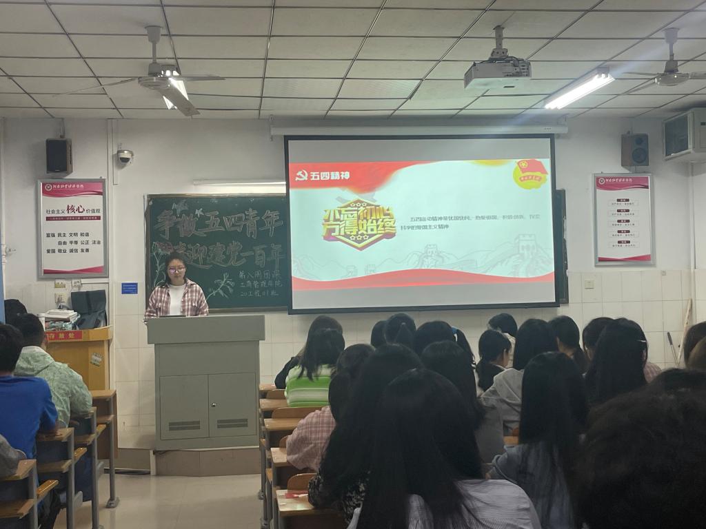 团课伊始,各班团支书带领大家重温入团誓词,迎接“五四运动”102周年纪念日。同学们通过认真学习“爱国、进步、民主、科学”的五四精神,深刻认识到作为团员青年应在新时代明使命、敢担当、有作为。之后,团支书与大家共同学习了习近平总书记在清华大学考察时的重要讲话内容,并开展课堂讨论活动,通过激烈的讨论,大家对“如何成长为肩负民族复兴历史使命的时代新人”有了深刻的理解,团员们纷纷开始有序发言,团课氛围活跃,掌声如潮。最后,各班继续开展党史系列教育,在坚定“四个自信”的同时,汲取奋斗力量,喜迎建党百年。