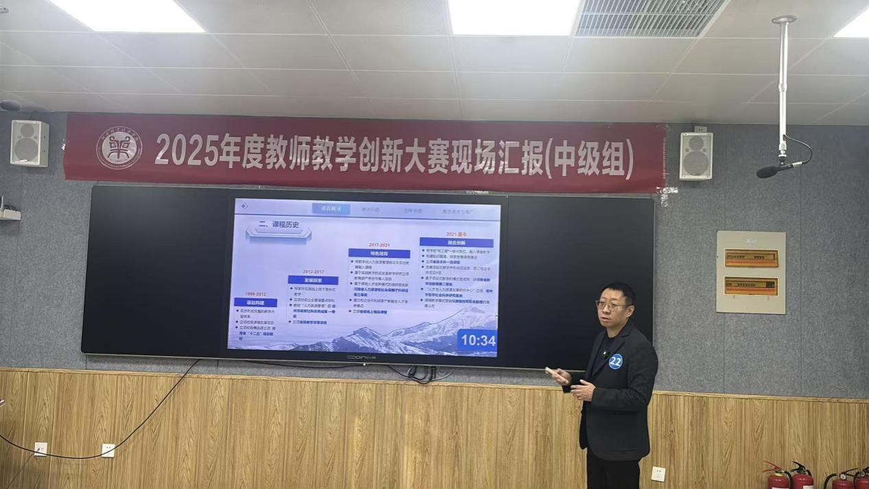 本届大赛吸引了全校各学院教学精英参与,竞争激烈。刘哲老师团队参赛课程融合前沿教学理念,实现课程思政的深度融合,并采用AI赋能的教学设计,展现出扎实的教学功底和显著的创新成效。在网络评审环节,该课程材料内容充实、逻辑清晰、创新点突出;在现场汇报中,刘哲老师沉着稳健、表达生动,系统阐释了教学中的关键问题、创新解决方案与实施成效,赢得了评审专家的一致高度评价。