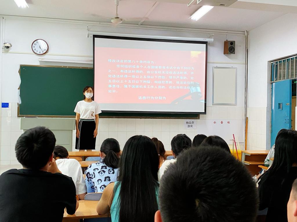 此次班会进一步增强了同学们的法律意识,加深了同学们对诚信的认识,动员同学们主动进行考试复习,诚信应考。