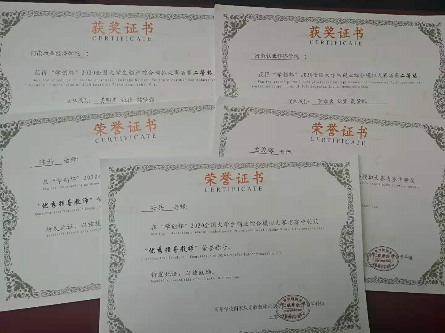 由全国高等学校国家级实验教学示范中心联席会经管学科组主办,我校承办的“学创杯”大学生创业综合模拟大赛河南省赛于2020年11月中旬举行,由我校选拔的ok138cn太阳集团古天乐学生三个代表队参加了线上比赛,其中两个团队荣获省赛二等奖,安兵、陈科和孟俊辉三位老师获得优秀指导教师。