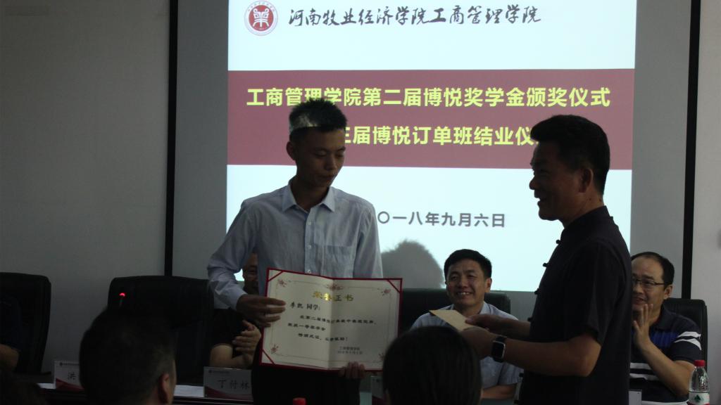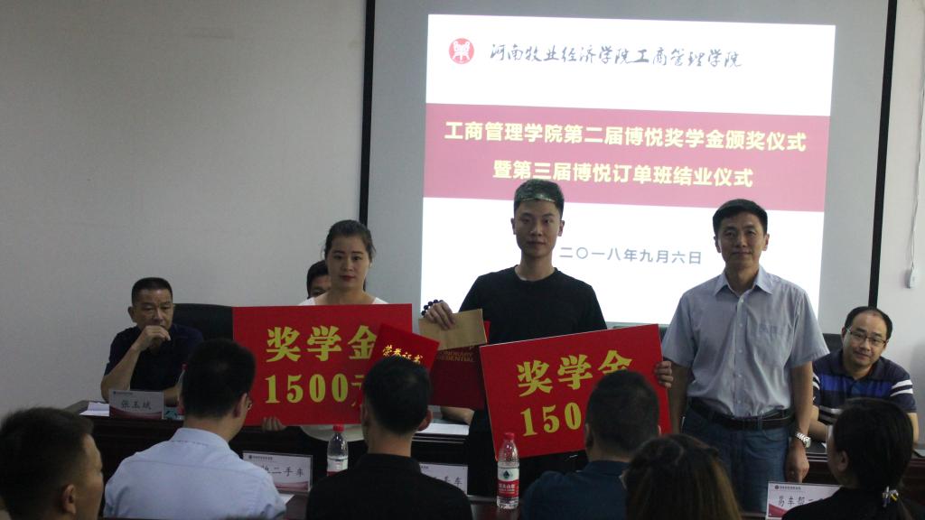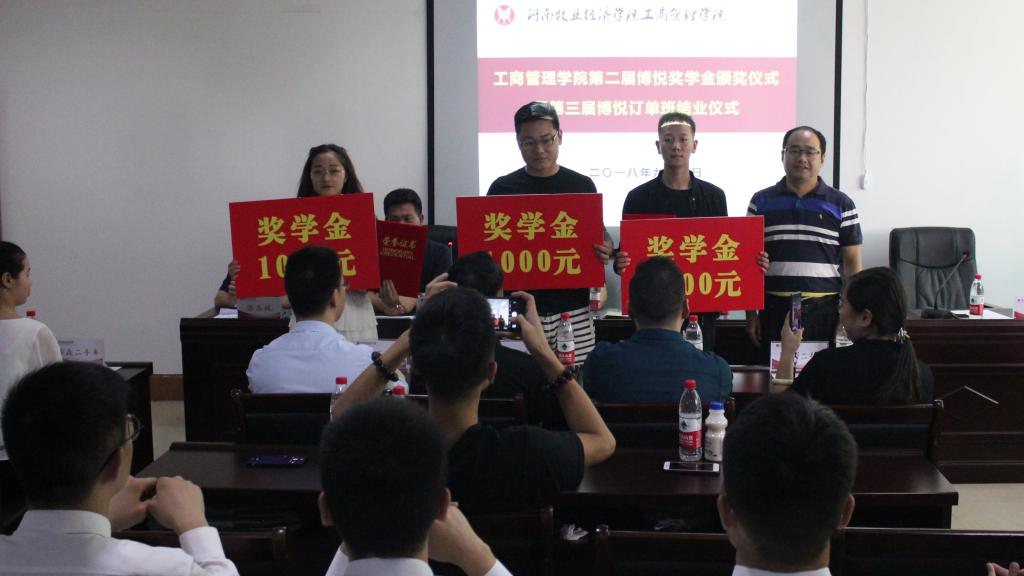 来自宝泽利、美驰、易车帮等品牌二手车企业的六名订单班学员获得博悦奖学金。来自宝岛台湾的嘉宾洪文魁为获得一等奖的李凯同学颁发证书和奖金。ok138cn太阳集团古天乐博悦订单班是全省高校中首个面向二手车行业的订单班,打破了传统的师徒培养制度,开创了全新的二手车校企合作人才培养模式。