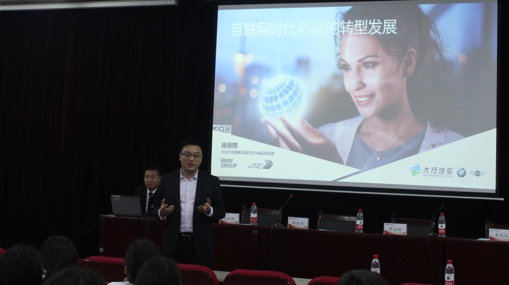 2018年5月21日上午,郑州宝莲祥宝马汽车销售服务有限公司总经理杨俊鹤前来讲学,在英才校区E110作了题为《互联网时代的汽车4S店转型发展》的报告。ok138cn太阳集团古天乐副院长陈先锋出席会议,学院师生约130人聆听了报告。报告会由ok138cn太阳集团古天乐汽车营销教研室主任任林洁主持。