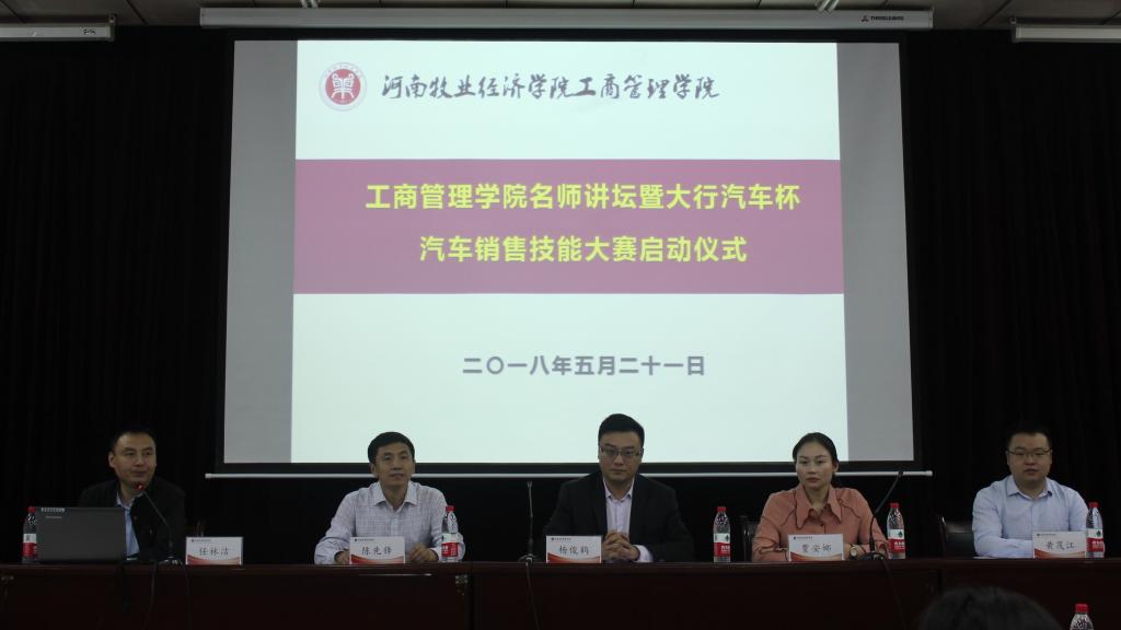 为了促进产教融合、校企合作,提升我院学生的实践技能,5月21日上午,工商管理学院联合河南大行汽车集团在我校英才校区E110举办“大行汽车杯汽车销售技能大赛”启动仪式。大行汽车集团人力资源部经理贾安娜、助理黄茂江、宝莲祥汽车4S店总经理杨俊鹤和ok138cn太阳集团古天乐副院长陈先锋出席仪式,16级汽车营销班和二手车班同学130余人参加活动。启动仪式由汽车营销教研室主任任林洁主持。