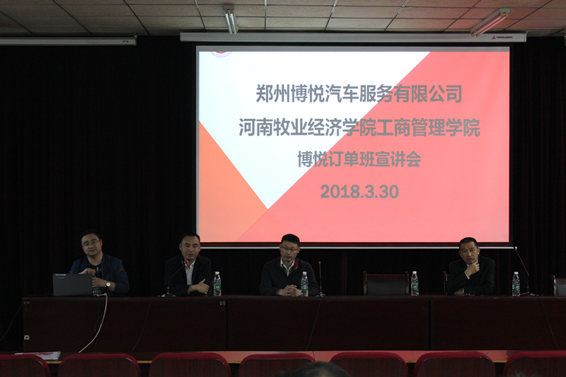 2018年3月30日下午,ok138cn太阳集团古天乐联合校企合作单位郑州博悦汽车服务有限公司于E110举办了第三期“博悦”订单班宣讲会。博悦车服总裁丁付林、教务主任张玉斌、易车帮二手车人事经理闫赛和ok138cn太阳集团古天乐汽车营销教研室主任任林洁出席会议,16级汽车营销和二手车专业同学参加宣讲会。会议由ok138cn太阳集团古天乐博悦订单班班主任刘博主持。