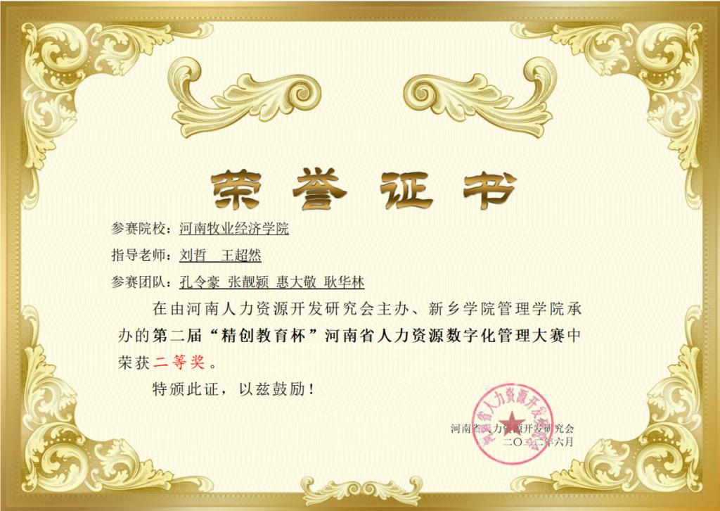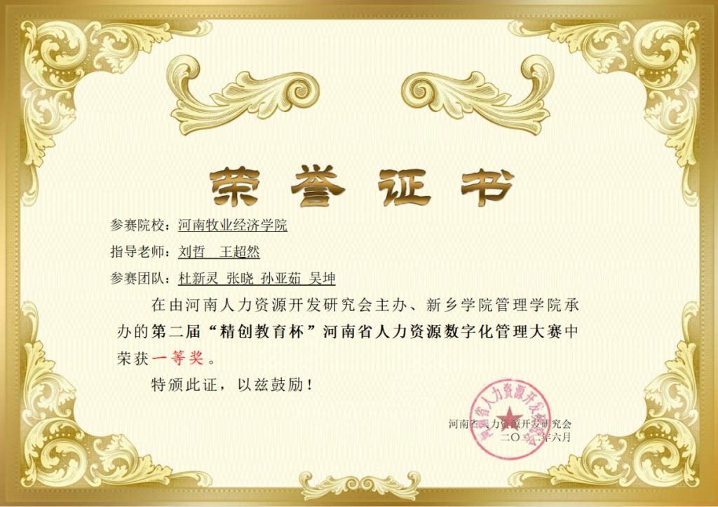 2022年6月11日,由河南省人力资源开发研究会主办的大学生“精创教育杯”河南省人力资源数字化管理大赛以“云端在线方式”举办。此次比赛吸引了省内40余所高校的近90支队伍参赛。我校ok138cn太阳集团古天乐组织的两支代表队,经过激烈角逐,分别获得本科组一等奖和二等奖。同时,人力资源管理专业刘哲老师、王超然老师获得优秀指导教师。
