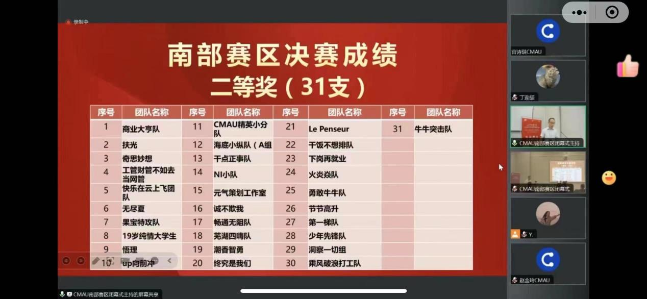 本次决赛由行业及校内专家担任评委,以匿名的方式参与评审。参赛队伍成员按照抽签顺序,依次上场进行PPT讲解展示并依次回答老师提出的问题,现场气氛热烈。经过紧张激烈角逐,最终评出一等奖三名、二等奖六名、三等奖八名,其中前四名的队伍最终获得晋级区赛的资格,“悟理”队与“畅通无阻”队代表我校在南部分区赛决赛中荣获二等奖。