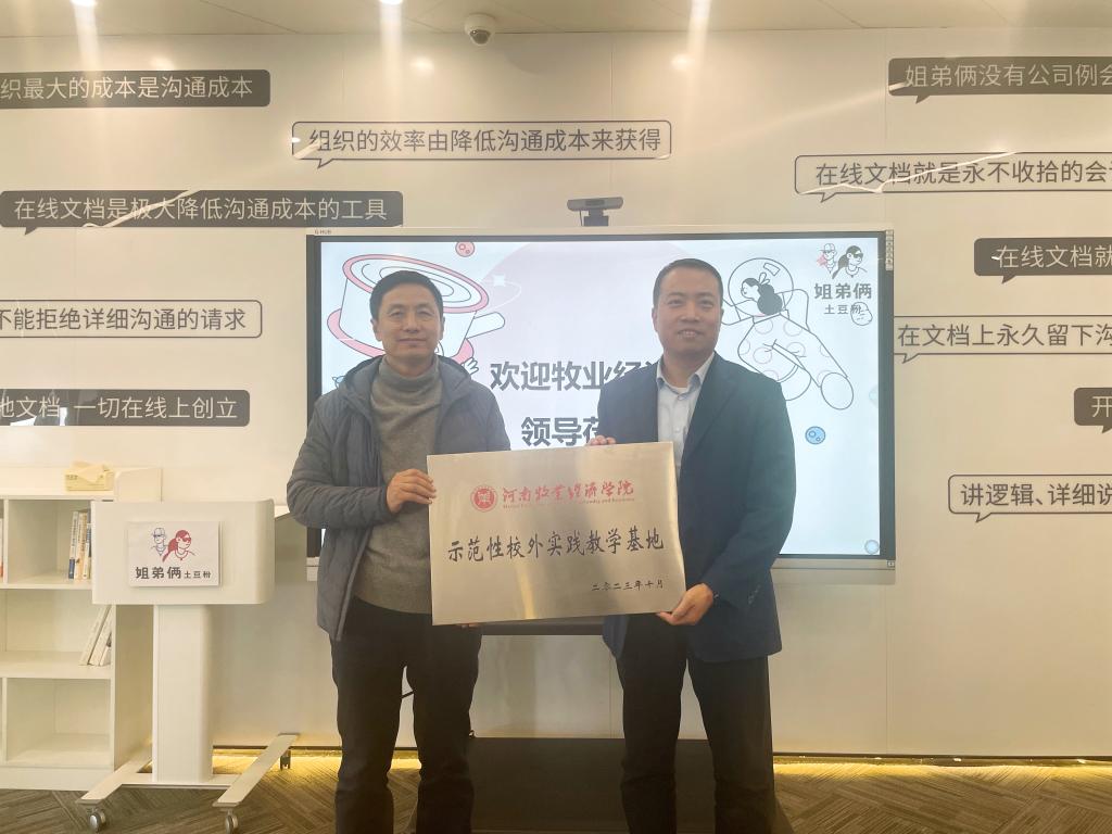 首先,陈先锋代表学校向姐弟餐饮管理有限公司总经理冯太祥颁发“示范性校外实践教学基地”牌匾,并合影留念。陈先锋感谢姐弟餐饮管理有限公司一直以来对学校和学院校企合作工作的大力支持,希望双方进一步加强合作的广度和深度,力争早日达成将姐弟餐饮实习基地建成省级大学生校外实践教育基地的愿景。冯太祥总经理对学校给予姐弟餐饮的认可表示衷心感谢,表示将积极配合学校,推动姐弟餐饮实习基地建设再上新台阶。