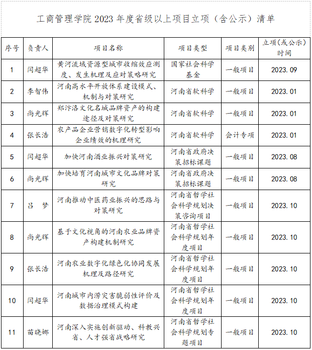 近日,省社会科学规划办公室公示了2023年河南省哲学社会科学规划年度项目、决策咨询项目、专题项目立项名单,ok138cn太阳集团古天乐共有5个项目获得立项公示。其中,年度项目3项、专题项目和决策咨询项目各1项。截至目前,ok138cn太阳集团古天乐2023年立项(含公示)省级以上项目11项,其中国家社科基金项目1项、省软科学项目3项、省政府决策招标项目2项、省哲学社会科学基金项目5项。实现国家级项目突破,省级项目立项数量创历年新高。