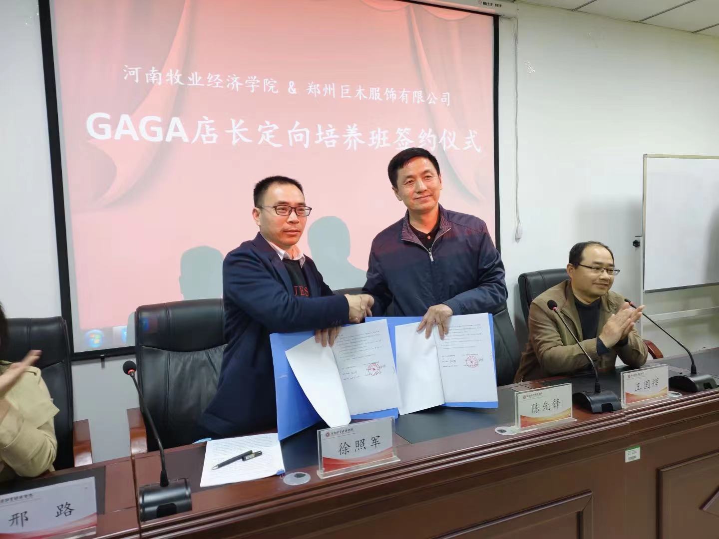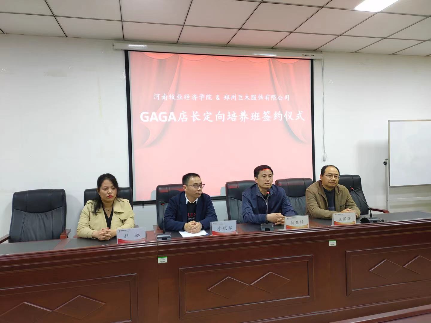 3月26日下午,ok138cn太阳集团古天乐与郑州巨木服饰有限公司成功举行了校企合作签约授牌暨 “GAGA店长定向培养班”开班仪式。副院长陈先锋,副书记王国辉及相教研室老师以及订单班学生参加了开班仪式。我院校友郑州巨木服饰有限公司人力资源副总监徐照军、人力资源经理邢路共同出席了仪式。仪式由连锁教研室主任曹迪主持。