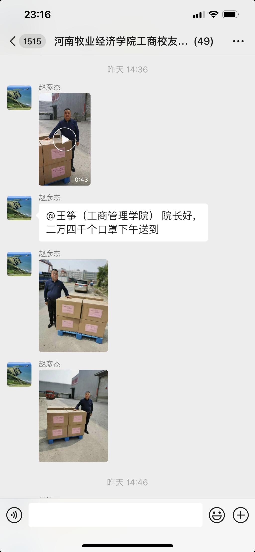 校友赵彦杰在校友群中倡议:“赵敏老师在校友会群众发了倡议书,今年虽然是各行都很困难,但母校有困难,我们也有义务帮助支持,希望各校友会理事力所能及的捐赠一批防疫消耗品。让我们急学校所急,力所能及支持学院,共渡难关。”说到动情之处,赵彦杰校友更是有感而发:“思文化之衣钵,念品德之传承。人生的恩师之垂青,斯世当楷模视之。”