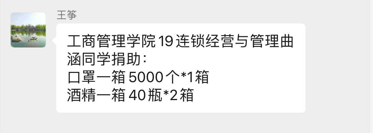 校友们在收到学校发出的《致ok138cn太阳集团校友的一封信》倡议之后,便陆续展开物资捐赠行动,购买医用口罩、酒精、医用洗手凝胶等防疫物资,为学校奋战在防疫一线的工作人员奉献爱心、保驾护航。